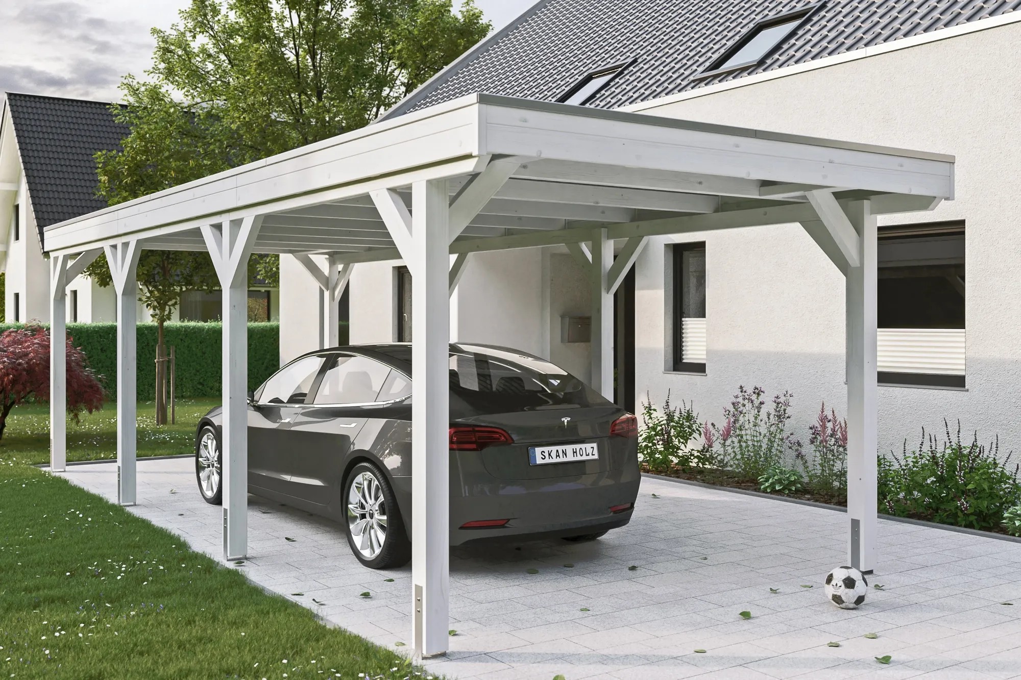 Prístrešky na auto Skan Holz Grunewald sú vyrobené z vysušeného smrekového dreva lepeného v niekoľkých vrstvách. Táto zmes je odolnejšia proti poveternostným vplyvom a je menej náchylná na praskanie ako prirodzené drevo. Stĺpiky prístrešku o rozmere 12 x 12 x 220 cm sú dodávané vrátane ukotvenia v tvare písmena H. 60 cm dlhé H-kotvy sú vyrobené z pozinkovanej plochej ocele na zabetónovanie do vlastného bodového základu. Kotvy pevne spájajú stĺpiky s podkladom a zaručujú vysokú stabilitu. Plochá strecha prístrešku je k dispozícii v dvoch variantoch - z hliníkových panelov (horná strana antracitová, spodná strana svetlo sivá) s trapézovým profilom (ALU) alebo s 19 mm strešným debnením s perodrážkou s dostatočným množstvom EPDM fólie. Strešná krytina z hliníkových panelov je nerozbitná a odolná proti krúpam, môže byť ale hlučná pri daždi. Je vysoko stabilná a tvarovo stála aj pri vysokých povrchových teplotách. Strecha je dodávaná s plastovými zvodmi.
