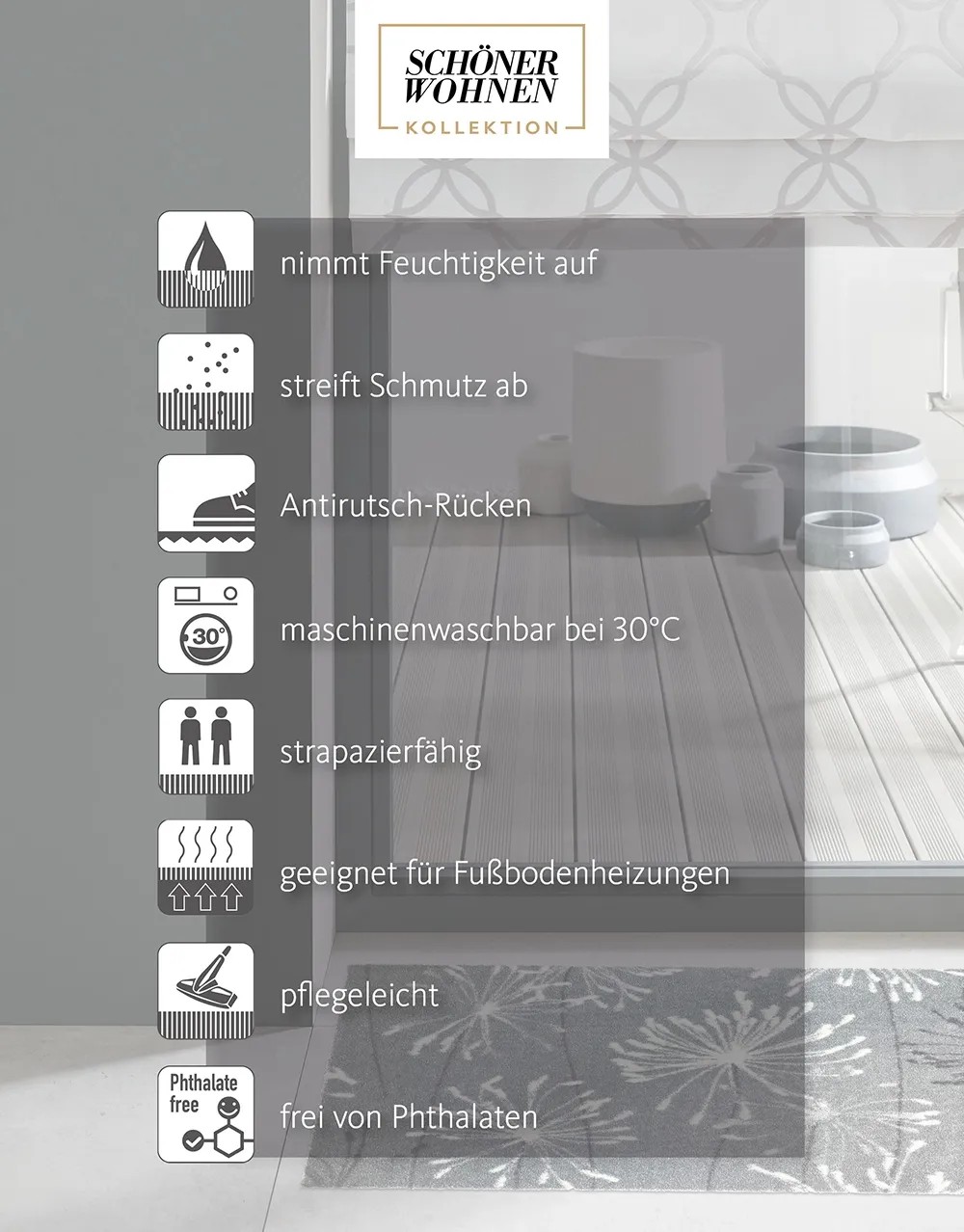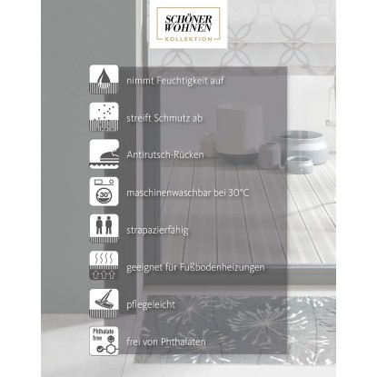Nové rohožky pred vstupné dvere z kolekcie Schöner Wohnen Manhattan nielen chránia podlahu pred nečistotami a vlhkosťou, ale presvedčia aj svojimi neporovnateľne brilantnými motívmi a farbami. Vďaka mäkkému povrchu dodávajú vstupné rohožky aj naboso príjemný pocit pod nohami, a preto sa hodí do každého obytného priestoru. V chodbe, kuchyni, kúpeľni alebo pred vstupnými dverami, nové podlahové rohože z kolekcie Schöner Wohnen sa optimálne hodia do Vášho prostredia. Sú k dispozícii v rôznych farbách a veľkostiach. Rohože majú spodnú stranu protišmykovú, sú vhodné pre podlahové vykurovanie, je možné ich prať v práčke na 30 °C a neobsahujú ftaláty.