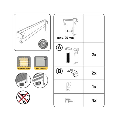 Rolety Gardinia EasyFix Double majú priemer návinu 18 mm a bočné retiazkové ovládanie s možnosťou voľby ovládania na pravej alebo ľavej strane. Rolety sa inštalujú pomocou upínacích držiakov priamo na okenné krídlo, lepením alebo prípadne skrutkovaním. Montáž pomocou upínacích držiakov je možná iba na okná s gumovým tesnením. Rozsah nastavenia držiaka je cca 15-22 mm (súčasťou balenia).