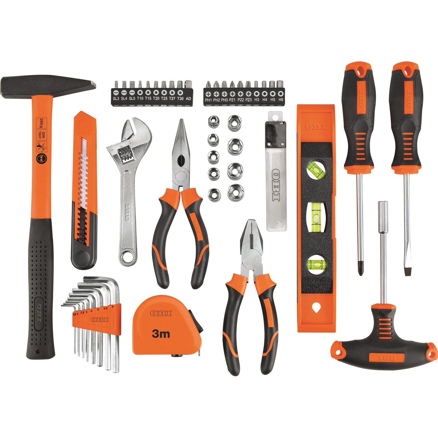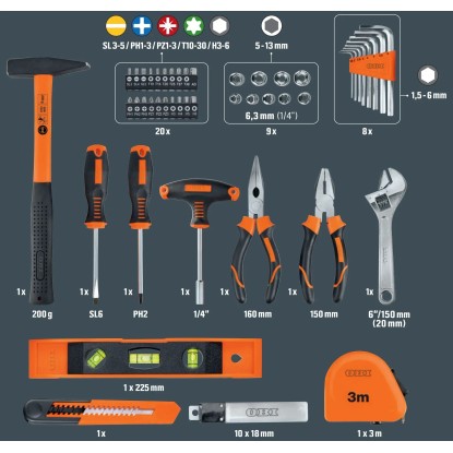 57-dielna súprava ručného náradia OBI Basic je ideálnym pomocníkom pre každodenné opravy a pre vaše hobby projekty. Vďaka tejto sade máte po ruke veľký výber bežného náradia. Náradie je vyrobené z kvalitnej a odolnej chróm-vanádiovej ocele a uhlíkovej ocele. Kladivo, skrutkovače a kliešte sú vybavené ergonomickými rukoväťami, padnú príjemne do ruky a umožňujú presnú prácu. Náradie je dodávané v uzamykateľnom oranžovo-čiernom plastovom kufri s rukoväťou na prenášanie, takže máte náradie vždy usporiadané a po ruke.