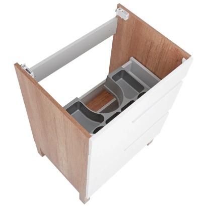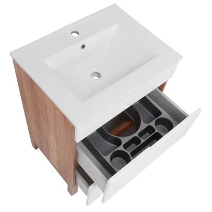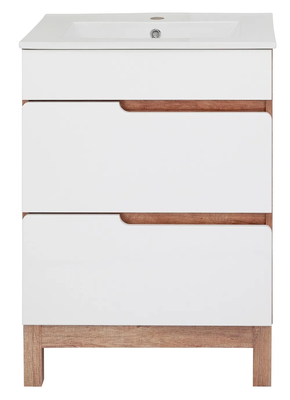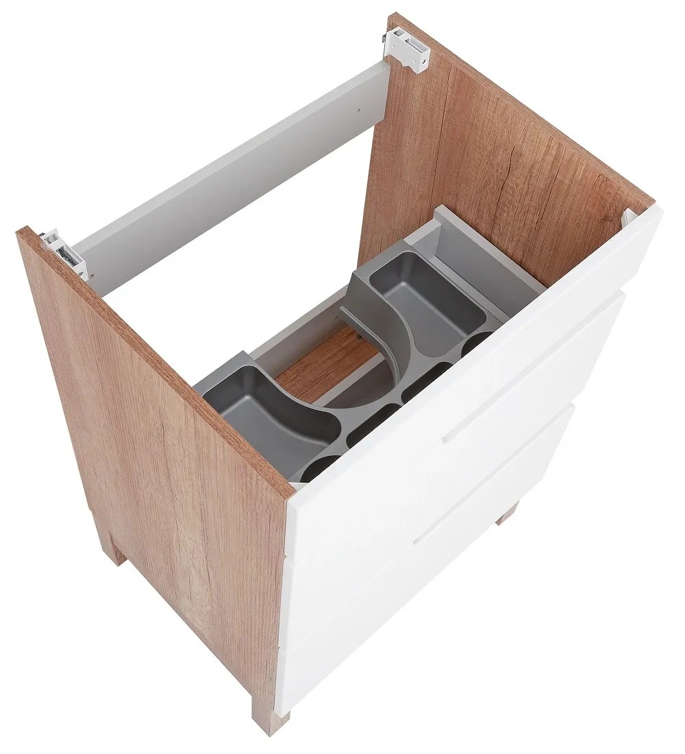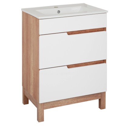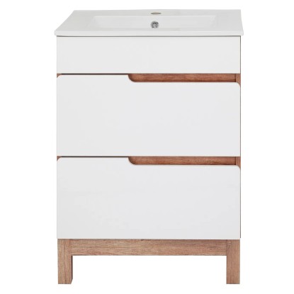 Voľne stojaca kúpeľňová skrinka Dorian 60-2Z s keramickým umývadlom 60 cm elegantne doplní Vašu kúpeľňu. Moderný štýl podčiarkuje kombinácia lesklých bielych povrchov s doplnkami v imitácii dreva. Korpus skrinky je vyrobený zo 16 mm LTD dosky v dekore dub country. Čelá zásuviek s frézovanými úchytmi sú z MDF dosky 16 mm s povrchovou úpravou lesklej fólie v bielej farbe. Nohy skrinky v dekore dub country sú vyrobené z MDF dosky 50 mm. Skrinka je vybavená dvoma zásuvkami na pojazdoch s tichým dovieraním SoftClose. V hornej zásuvke je výrez pre umývadlový sifón a praktický plastový organizér. Súčasťou skrinky je keramické umývadlo s prepadom a otvorom na montáž vodovodnej batérie. Rozmery skrinky vrátane umývadla (š x v x h): 615 x 853 x 470 mm.
