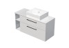 INTEDOOR kúpeľňová skrinka BEE s keramickým umývadlom na dosku je vyrobená z MDF 18 mm. Skrinka má dve zásuvky s funkciou pomalého dovierania Soft-Close a kryciu dosku o sile 1,8 cm. V hornej zásuvke je výrez na sifón. Umývadlo je umiestnené na pravej strane skrine. Na ľavej strane vedľa zásuviek je otvorená polica.