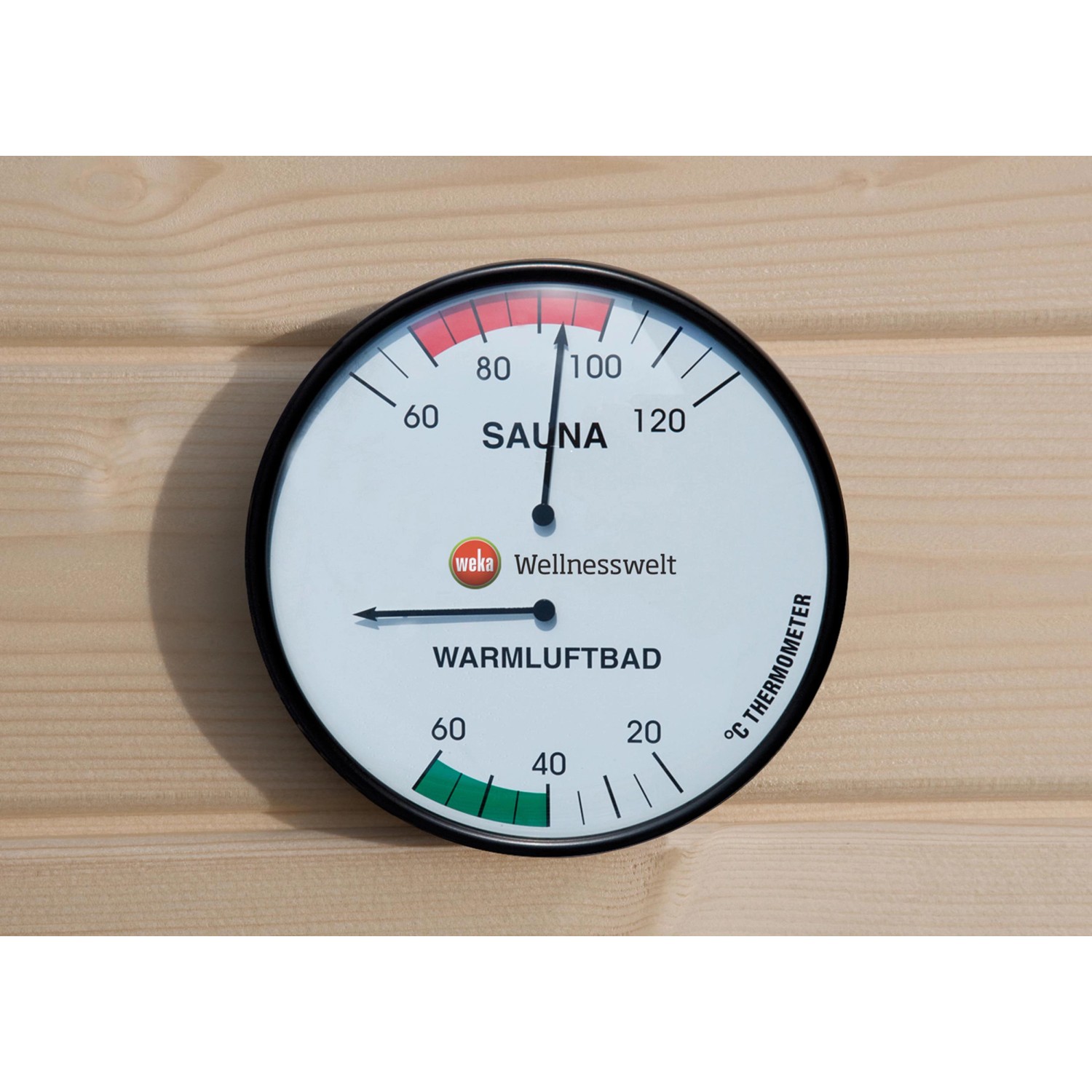 Pomocou Weka dvojitého teplomera zabijete hneď dve muchy jednou ranou. Zariadenie má dva meracie rozsahy: teplota pre klasické saunovanie a teplota pre parný saunový kúpeľ s kombinovanou pecou Bio.