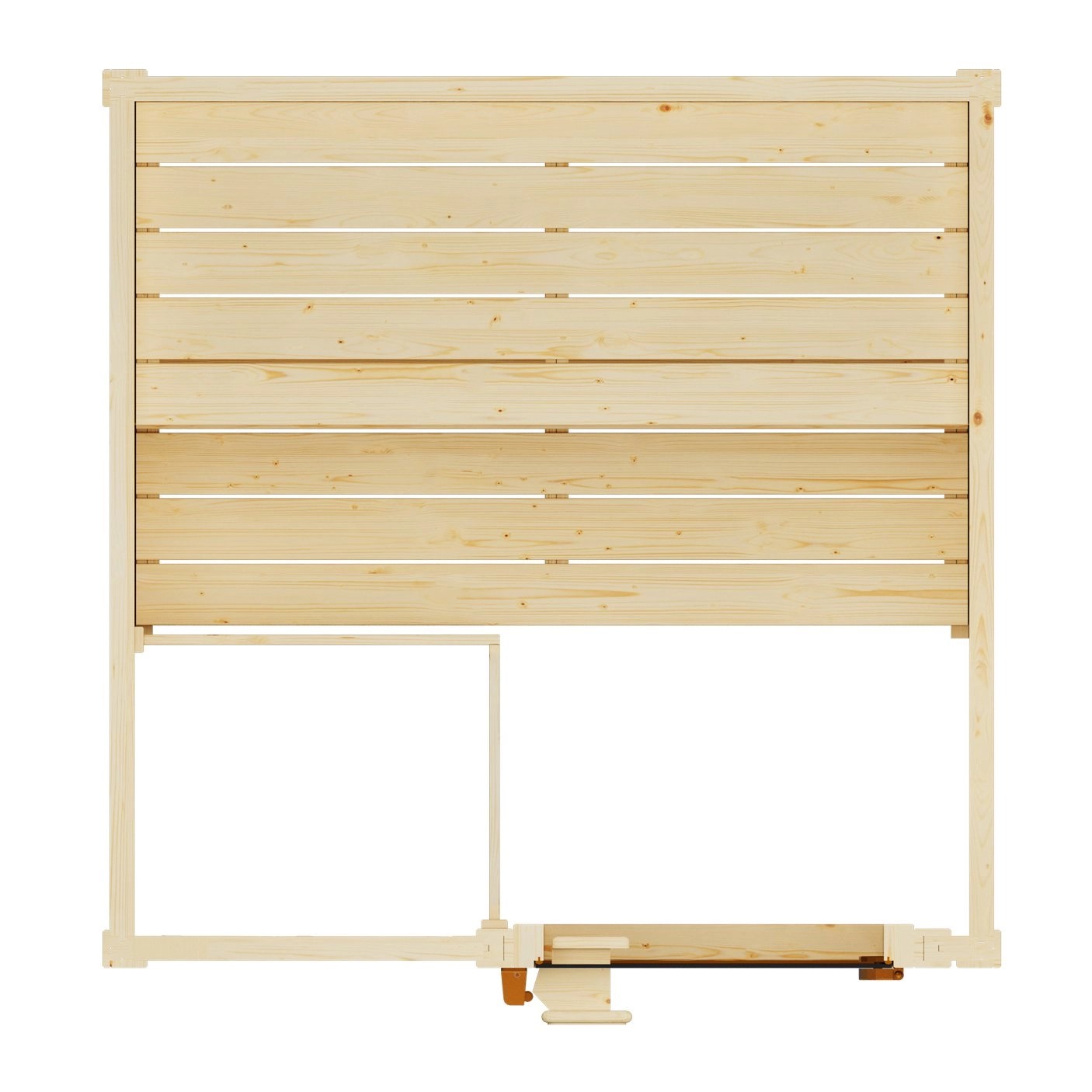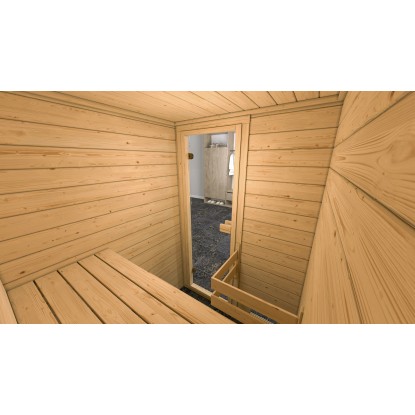 Saunový domček pozostáva z fošní s hrúbkou 38 mm, ktoré zabezpečujú príjemnú klímu a dlhú životnosť. Spojenie na pero a dvojitú drážku zabezpečuje maximálnu tesnosť a tvarovú stálosť.