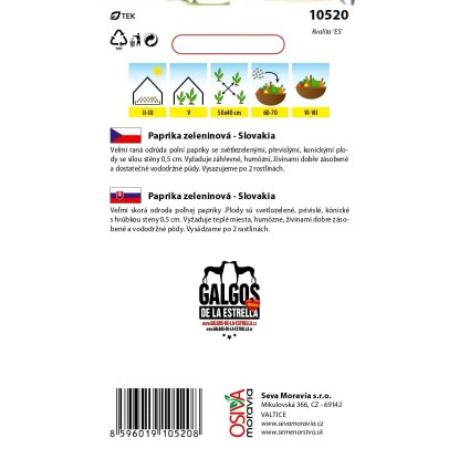 Veľmi skorá odroda poľnej papriky so svetlozelenými, previsnutými, kónickými plodmi so silou steny 0,5 cm. Vyžaduje záhrevné, humózne, živinami dobre zásobené a dostatočne vododržné pôdy. Vysádzame po 2 rastlinách.