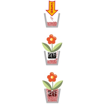 Použite vodotesnú nádobu vhodnej veľkosti a naplňte ju do 1/3 granulátom SERAMIS. Stavte do kvetináča rastlinu aj s koreňovým balom a doplňte nádobu granulátom SERAMIS. Ľahké poklepanie kvetináčom pomôže rovnomernému naplneniu nádoby granulátom.