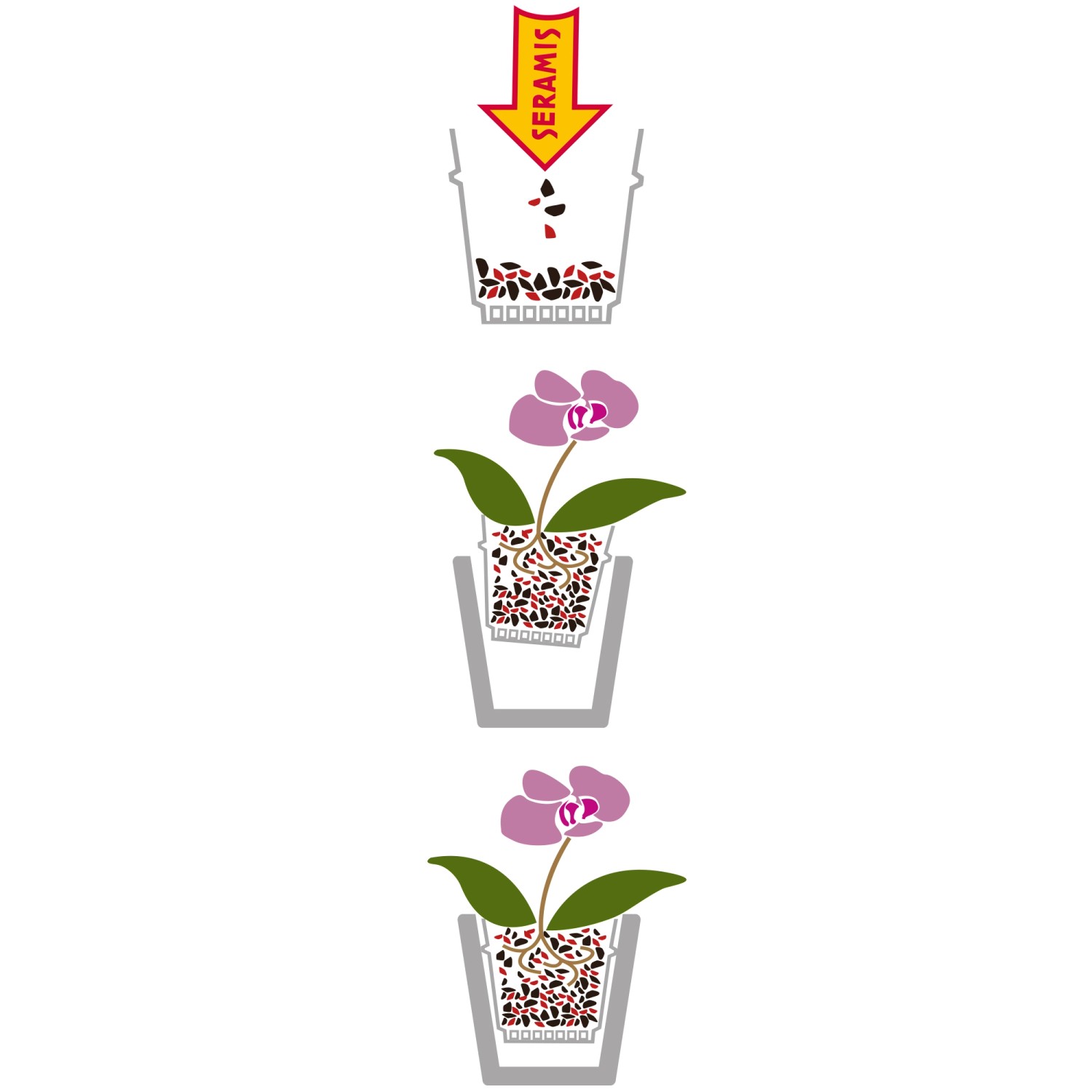 Použite nádobu vhodnej veľkosti s drenážnym otvorom, ktorý zakryte kamienkami alebo hlineným črepom. Nádobu naplňte do 1/3 SERAMIS substrátom pre palmy. Rastlinu aj s koreňovým balom stavte do kvetináča a doplňte nádobu substrátom SERAMIS. Ľahké poklepanie kvetináčom pomôže rovnomernému naplneniu nádoby substrátom.