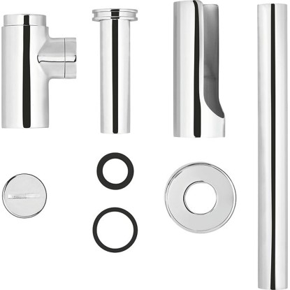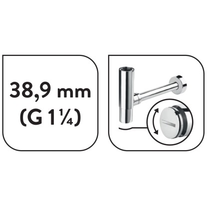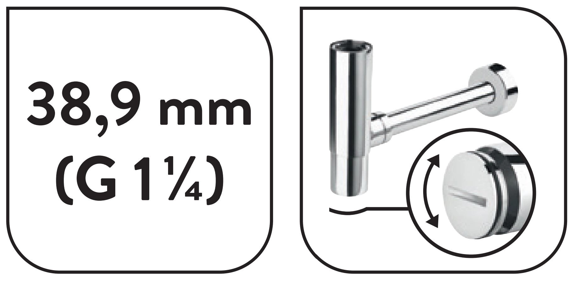 Dizajnový okrúhly sifón série č. 10. Fľaškový uzáver proti zápachu je navrhnutý špeciálne umývadlo a vďaka skrutkovej zátke na spodnej strane sa ľahko čistí. Vr. rozety, spojovacie rúrky (300 mm) a ponorné rúrky pre inštalačné rozmery od 15 do 80 mm. Montáž možná bez použitia náradia.