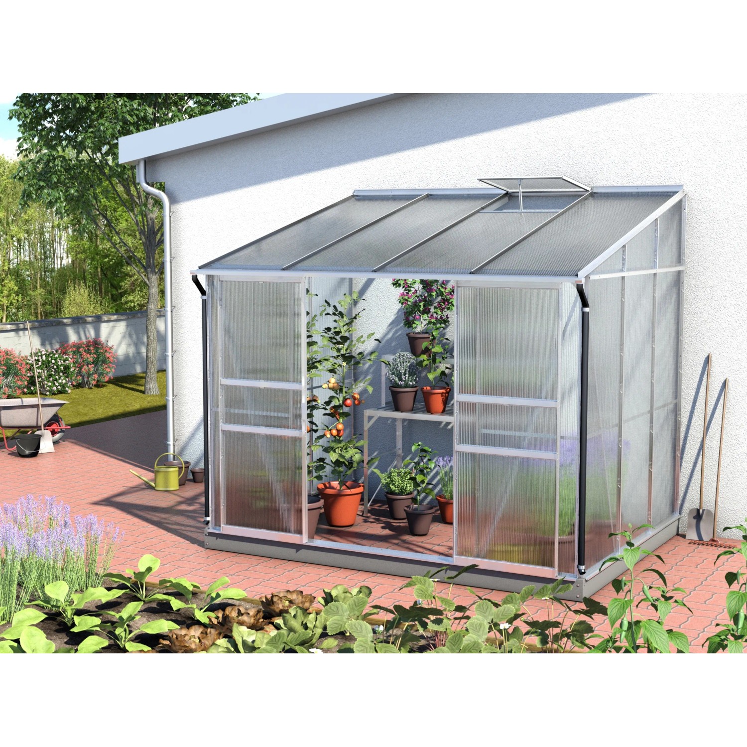 Dvojstenné dutinkové polykarbonátové panely (HKP) ponúkajú vysokú priepustnosť svetla, vynikajúcu tepelnú izoláciu a sú vybavené UV ochranou. Mliečne biele zafarbenie polykarbonátových panelov rozbíja svetlo, preto nie je nutné rastliny pri intenzívnom slnečnom žiarení dodatočne odtieniť.