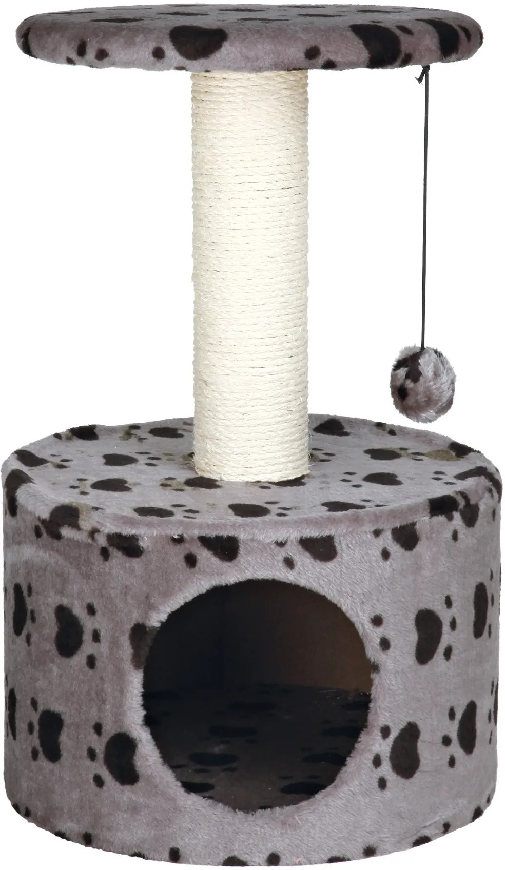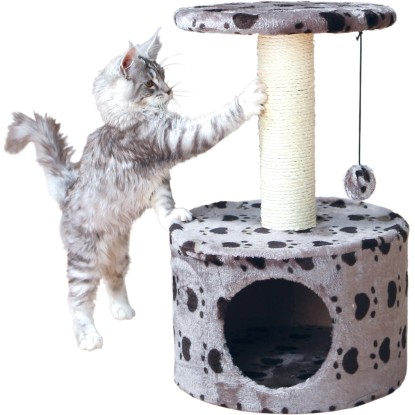 Vďaka tomu bude mať váš domáci miláčik čalúnenú, okrúhlu plochu na ležanie s jemným plyšovým poťahom a hračkou na šnúrke, ktorá ponúka komfortné a útulné miesto na oddych a hru. Kmeň z prírodného sisalu umožňuje vášmu miláčikovi brúsenie pazúrov a voľné využívanie prirodzených možností na škrabanie. Okrem toho je malý okrúhly flaušový tunel ideálnym miesto na úkryt, spánok a číhanie.
