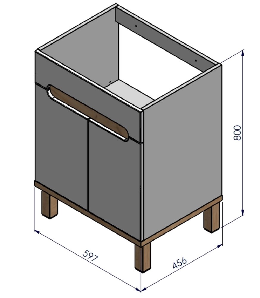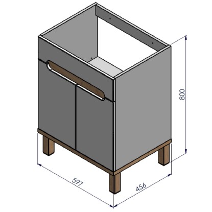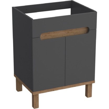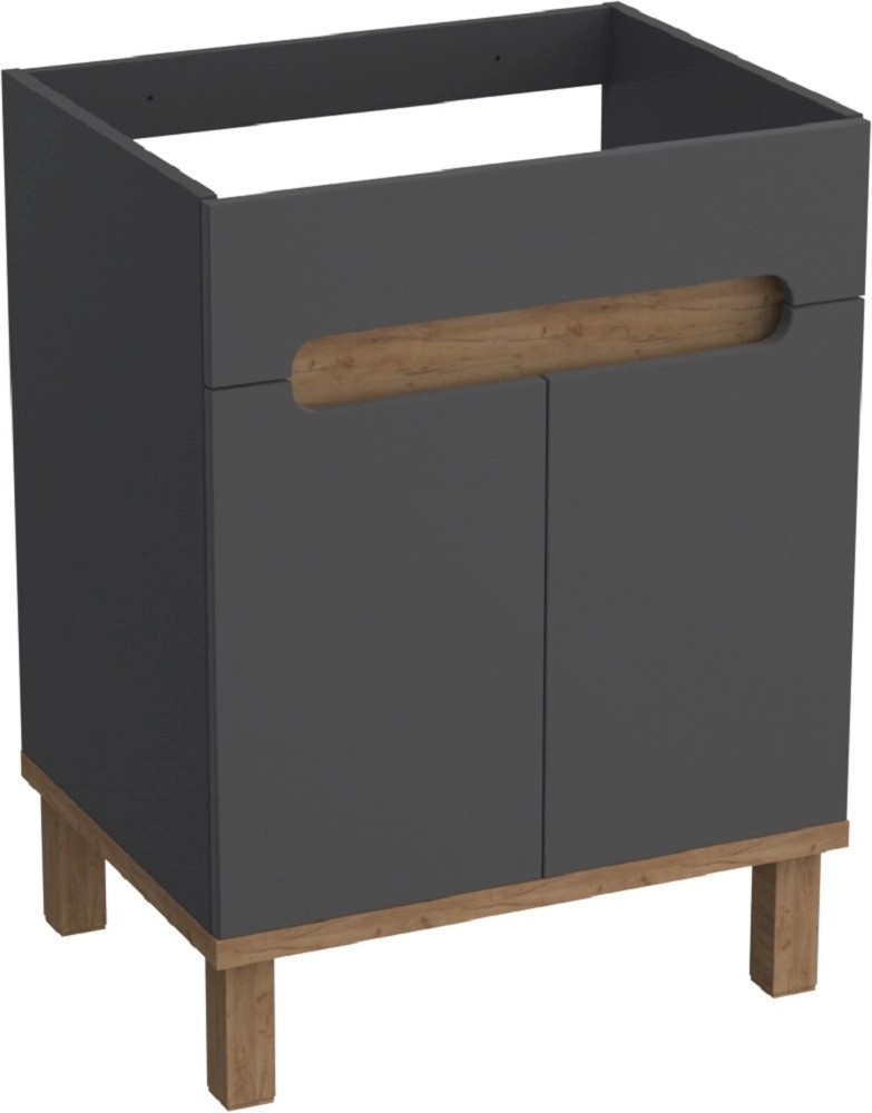 Kúpeľňová skrinka s keramickým umývadlom šírky 60 cm určená na postavenie na podlahu. Korpus skrinky je vyrobený z nelakovanej 16 mm hrubej LTD dosky šedej (antracitovej) farby v kombinácii so spodnou 25 mm hrubou LTD doskou v dekore Zlatý Dub. Dvierka s frézovanými úchytmi sú z MDF dosky hrúbky 16 mm s povrchovou úpravou matný antracitový lak. Na ustavenie na podlahu slúžia podperné nôžky s rozmermi 50 x 50 x 100 mm z MDF s povrchovou úpravou fólie v dekore zlatý dub. Skrinka je vybavená dvoma dvierkami s tichým dovieraním SoftClose. Súčasťou skrinky je keramické umývadlo s prepadom a otvorom na montáž vodovodnej batérie. Vnútri skrinky je umiestnená jedna výškovo nastaviteľná polica z LTD dosky antracitovej farby.