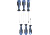 Skrutkovače sú opatrené ergonomickou 2-zložkovou rukoväťou, ktorá umožňuje bezpečnú prácu a príjemnú manipuláciu. Súčasťou 6dielnej sady sú skrutkovače s profilom Torx s veľkosťou TX8 x 60 mm, TX10 x 100 mm, TX15 x 100 mm, TX20 x 100 mm, TX25 x.