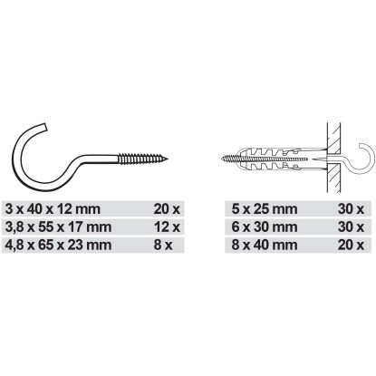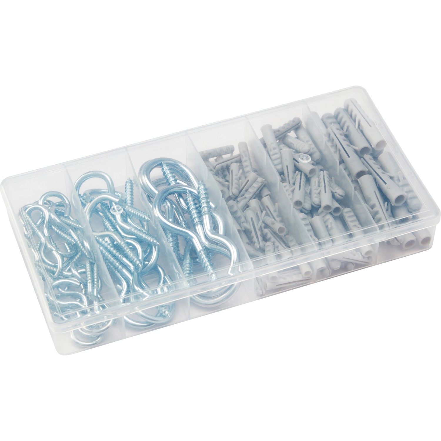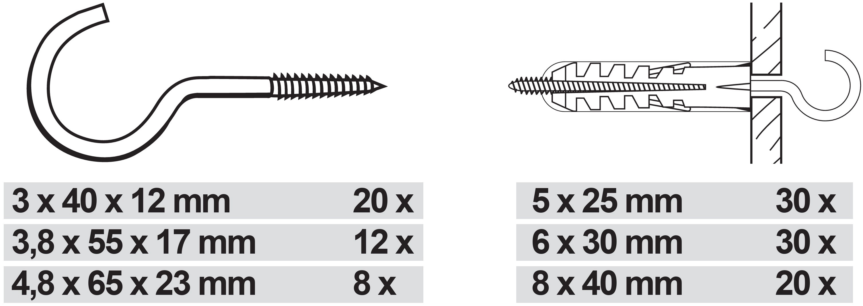 Hľadáte spoľahlivé a jednoduché riešenie, ako bezpečne pripevniť predmety na steny a naliehavo potrebujete poriadok v zásuvke? 120dielna súprava hákov v prehľadnom boxe poskytuje perfektné riešenie a kombináciu robustných skrutiek s hákom a vhodných hmoždiniek v rôznych bežných veľkostiach.