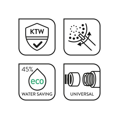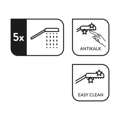 Všetky diely sú dimenzované tak, aby vaše sprchové príslušenstvo bolo robustné a malo dlhú životnosť. Máte chuť na rozmanitý zážitok zo sprchovania? Vďaka piatim rôznym druhom prúdu si môžete prúd vody nastaviť podľa svojich predstáv. Pre maximálne uľahčenie čistenia je ručná sprcha chránená nopkami proti usadzovaniu vodného kameňa. Vďaka normalizovanej prípojke 21 mm (G 1/2) je ručná sprcha vhodná pre všetky štandardné sprchové hadice. Na montáž nepotrebujete žiadne náradie.