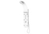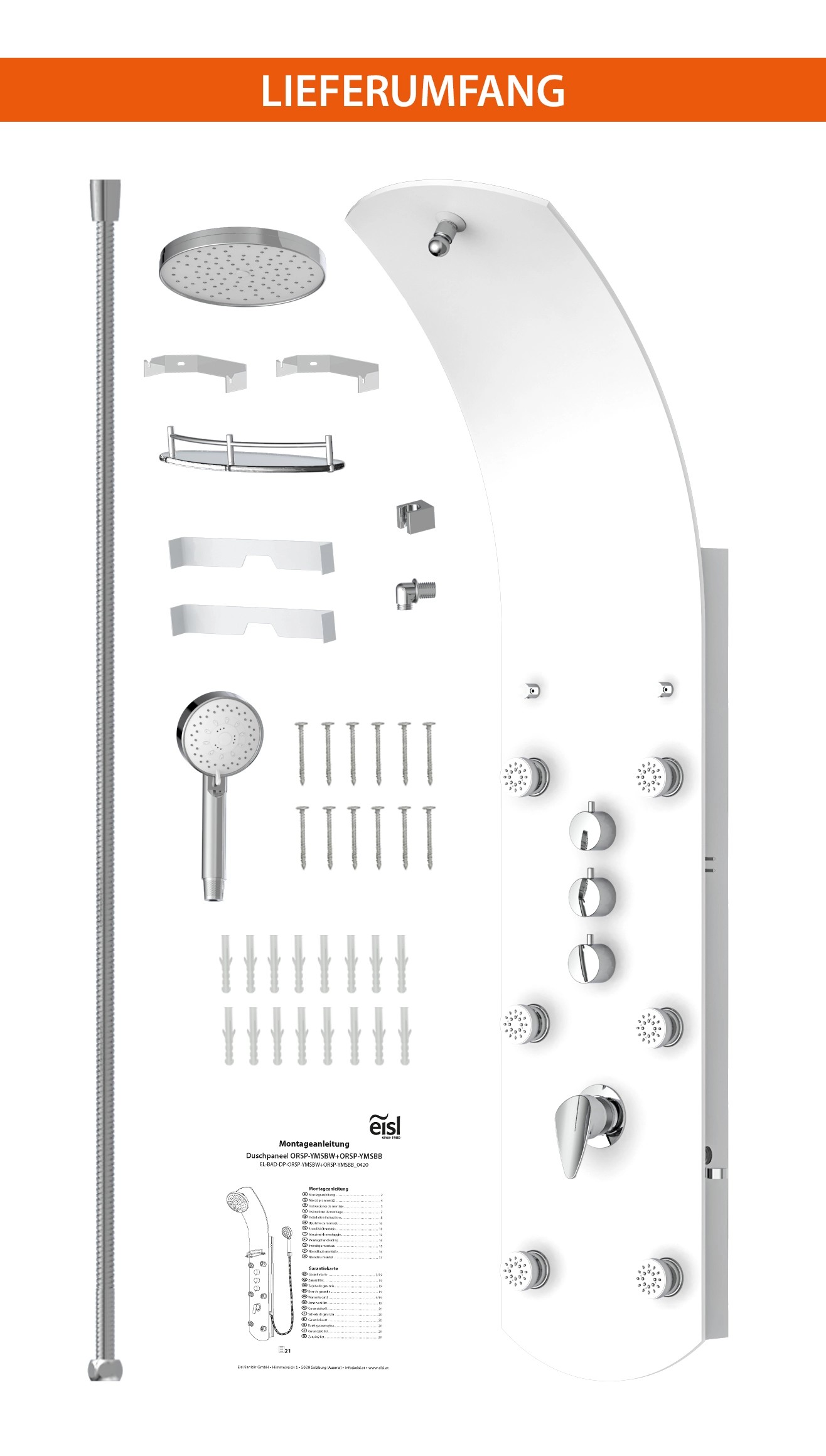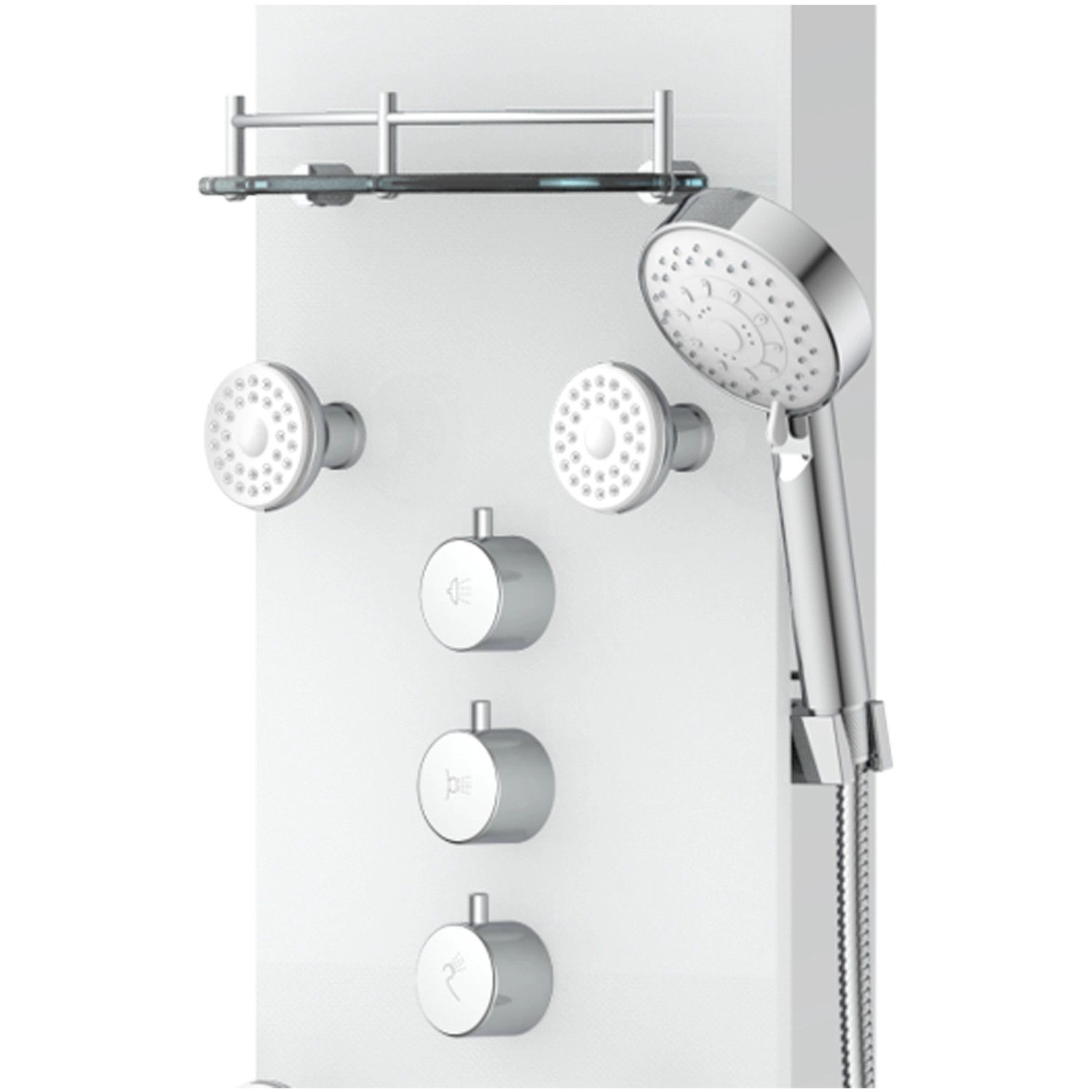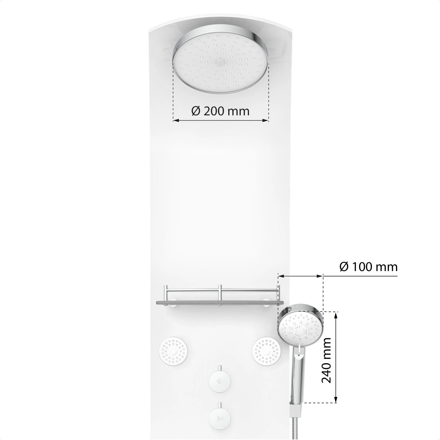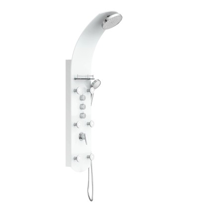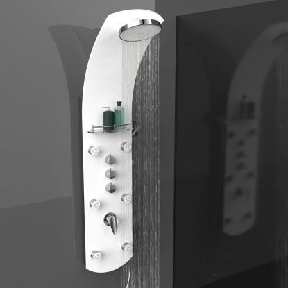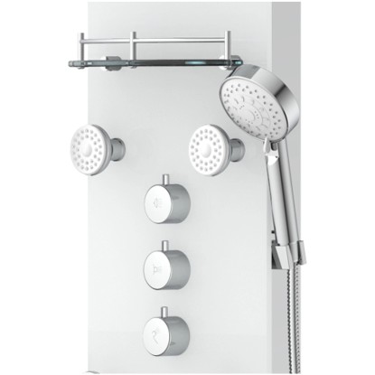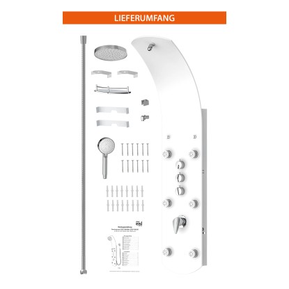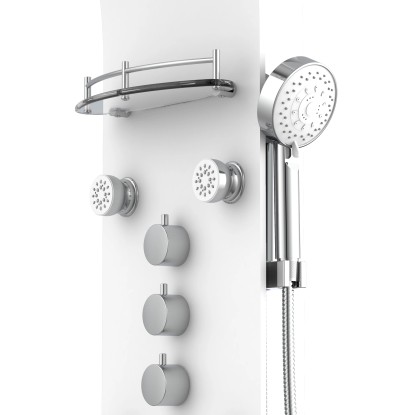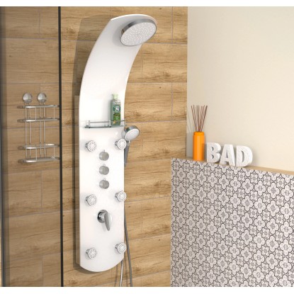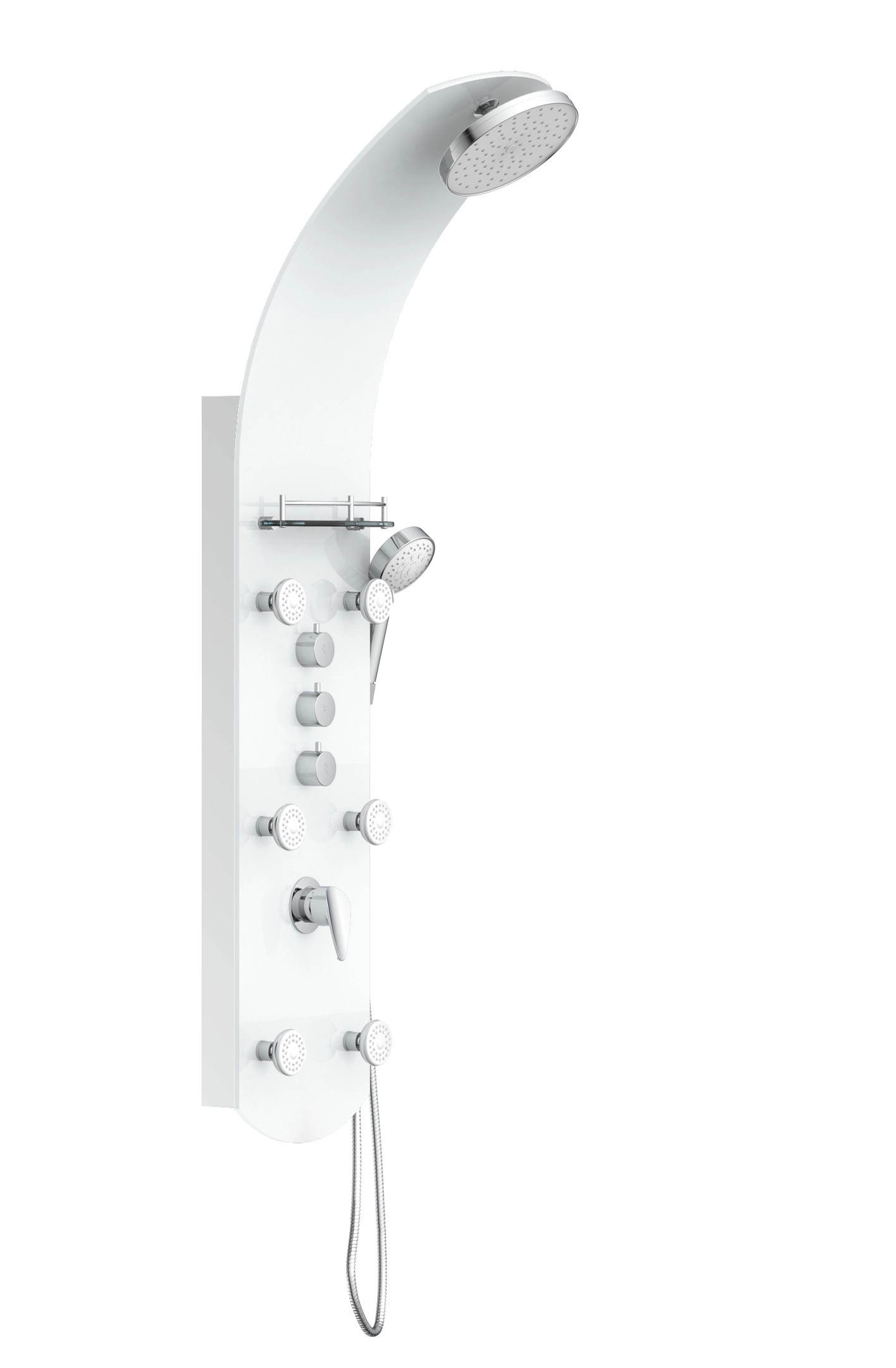 Exkluzívny sprchový panel z vysoko kvalitného, bieleho bezpečnostného skla, upúta pozornosť každého, kto vstúpi do Vašej kúpeľne. Zažijete čistú relaxáciu vďaka hornej sprche, ručnej sprche a šiestimi nastaviteľnými chrbtovými tryskami, začnete nový deň sviežo s veľkoformátovou wellness hlavovou sprchou alebo sa večer nechajte hýčkať doplnkovými chrbtovými tryskami. Pomocou troch samostatne nastaviteľných ventilov môžete v závislosti na type sprchy jednoducho prepínať medzi sprchovými zdrojmi. Sprchový panel je vybavený aj jednopákovou batériou s nehlučnou kartušou s odolným keramickým tesnením. Elegantné sklenené police s nerezovým zábradlím ponúkajú dostatok úložného priestoru a bezpečné uchytenie sprchového náradia. Gombíky proti vodnému kameňu na sprchových hlaviciach uľahčia odstránenie zbytkov vodného kameňa. Vďaka kompletnej montážnej sade a jednoducho zrozumiteľnému návodu k montáži hravo zvládnete inštaláciu.