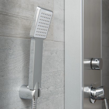 Sprchový panel Tahiti vytvorí relaxačnú wellness atmosféru pri sprchovaní. Široká štvorcová hlavová sprcha (19,5 cm x 19,5 cm) má veľkú plochu a vďaka tomu poskytuje mimoriadne široký, príjemný prúd vody. Rovnako hranatá ručná sprcha má vlastný nástenný držiak a so sprchovým panelom je spojená prostredníctvom 170 cm dlhej sprchovej hadice. Sprchový systém je aj funkčne vzájomne zladený. Prepínanie medzi hlavovou a ručnou sprchou, ako aj ich špecifické nastavovanie je mimoriadne jednoduché.