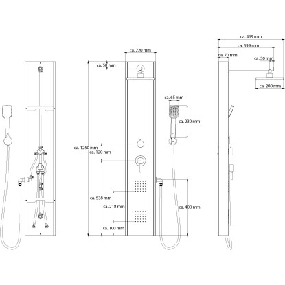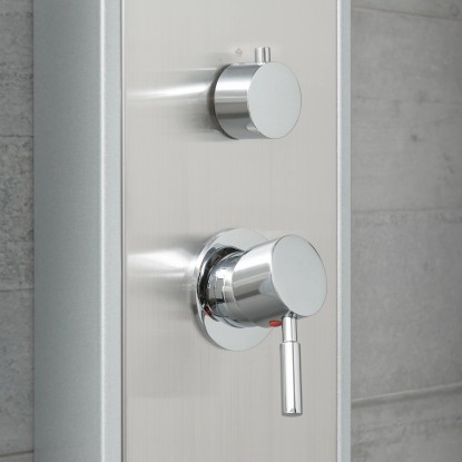 Mimoriadnym prvkom tejto sprchovej súpravy sú dve masážne dýzy vo výške trupu. Svojím prúdom vody vám poskytnú relaxačný a povzbudzujúci zážitok pri sprchovaní. Množstvo a teplotu vody všetkých spŕch a prúdov môžete pohodlne regulovať jednopákovou zmiešavacou batériou na sprchovom paneli.
