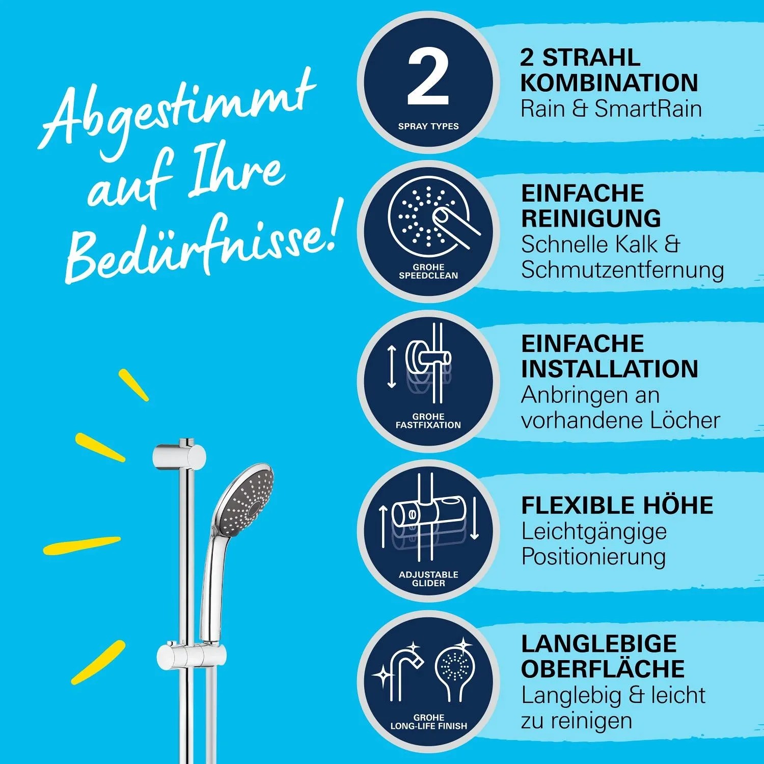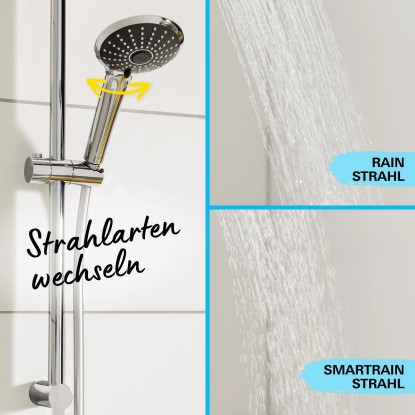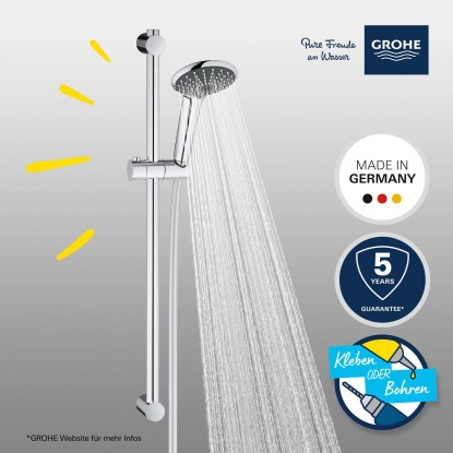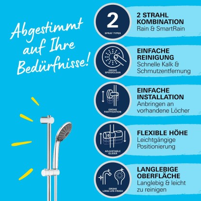 Vitalio Joy 110 Duo sprchový set s dvomi prúdu vody je ideálnou voľbou pre vašu kúpeľňu. Ponúka moderný dizajn, úspornosť a veľmi výkonné prevedenie. Hlavica o priemere 110 mm ponúka dva režimy - uvoľňujúci Rain režim a úsporný SmartRain, ktorý v kombinácii s technológiou SprayDimmer šetrí spotrebu vody. Tomu napomáha tiež GROHE EcoJoy technológia pre nízku spotrebu vody a perfektný prietok. Vnútorné WaterGuide prevedenie zaručuje dlhšiu životnosť hlavice. GROHE Starlight chrómový povrch je extrémne odolný proti povrchovému poškodeniu, GROHE SpeedClean umožňuje odstránenie vodného kameňa obyčajným pretrením. Twistfree úprava zabraňuje skrúteniu hadice. Systém Grohe QuickFix umožňuje nastavenie rozpätie svoriek tak, aby zodpovedalo škáram medzi obkladačkami.