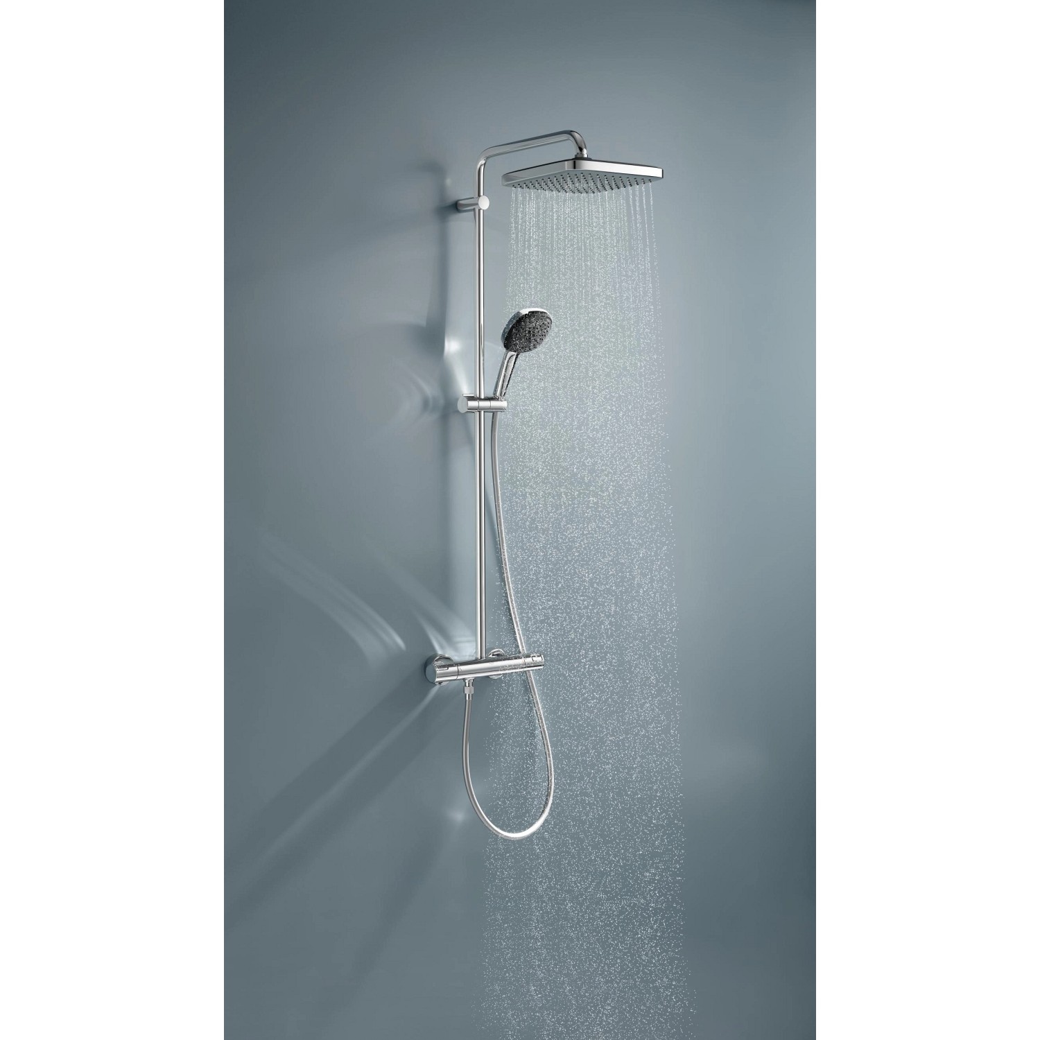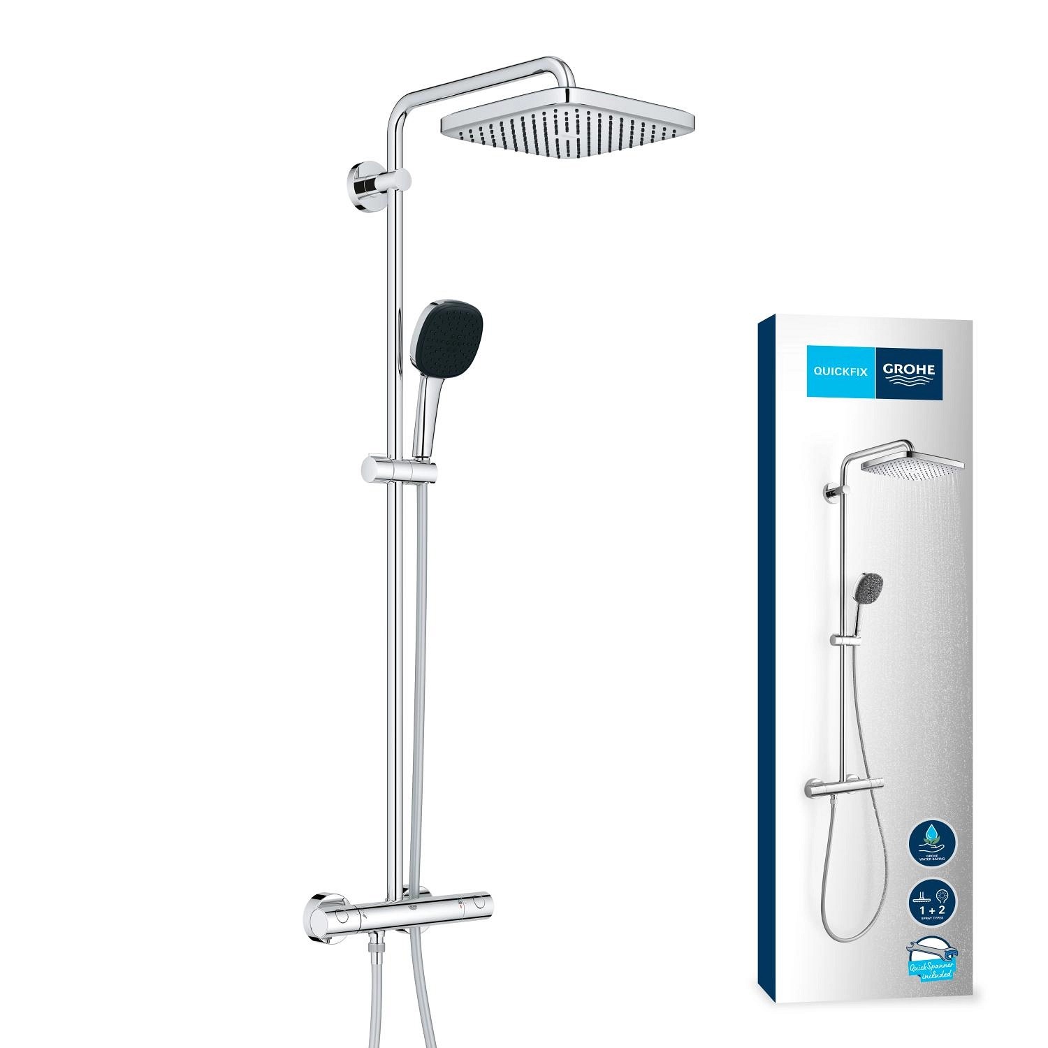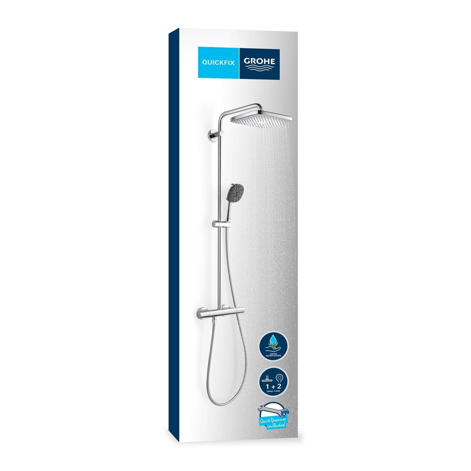 Hlavová sprcha ponúka jemný, relaxačný prúd Rain Spray. Ručná sprcha sa dodáva so silikónovým krúžkom ShockProof, ktorý ju chráni pred pádom alebo nárazom. Má 2 druhy prúdu, jemný Rain a výkonný, cielený Jet Spray. K obom je ľahký prístup pomocou inovatívneho prepínača GROHE SmartSwitch na zadnej strane sprchovej hlavice. Technológia GROHE DreamSpray zaisťuje rovnomerný prietok z každej trysky SpeedClean proti vodnému kameňu, ktorú je možné vyčistiť iba kefkou prsta. prchový systém dodáva vodu s konštantnou teplotou bez nepríjemných prekvapení vďaka technológii GROHE TurboStat.