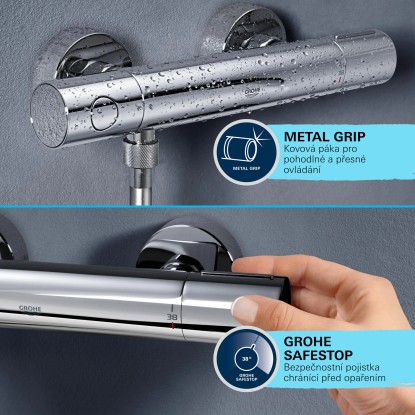 A technológia GROHE Water Saving výrazne znižuje spotrebu vody a energie bez toho, aby to bolo na úkor výkonu. Ovládanie je jednoduché vďaka ergonomickým rukovätiam GROHE MetalGrip, ktoré sa skvele držia aj v namydlených rukách. Na ochranu pred obarením je bezpečnostné tlačidlo GROHE SafeStop nastavené na 38 °C, aby najmä deti nemohli nechtiac zvýšiť teplotu vody príliš vysoko. A voliteľný obmedzovač GROHE SafeStop Plus je možné nastaviť na 43 °C pre vyššiu úroveň bezpečnosti. Pomocou funkcie AquaDi mmer môžete prepínať medzi hlavovou a ručnou sprchou a regulovať objem, a to všetko pomocou jednej rukoväte.