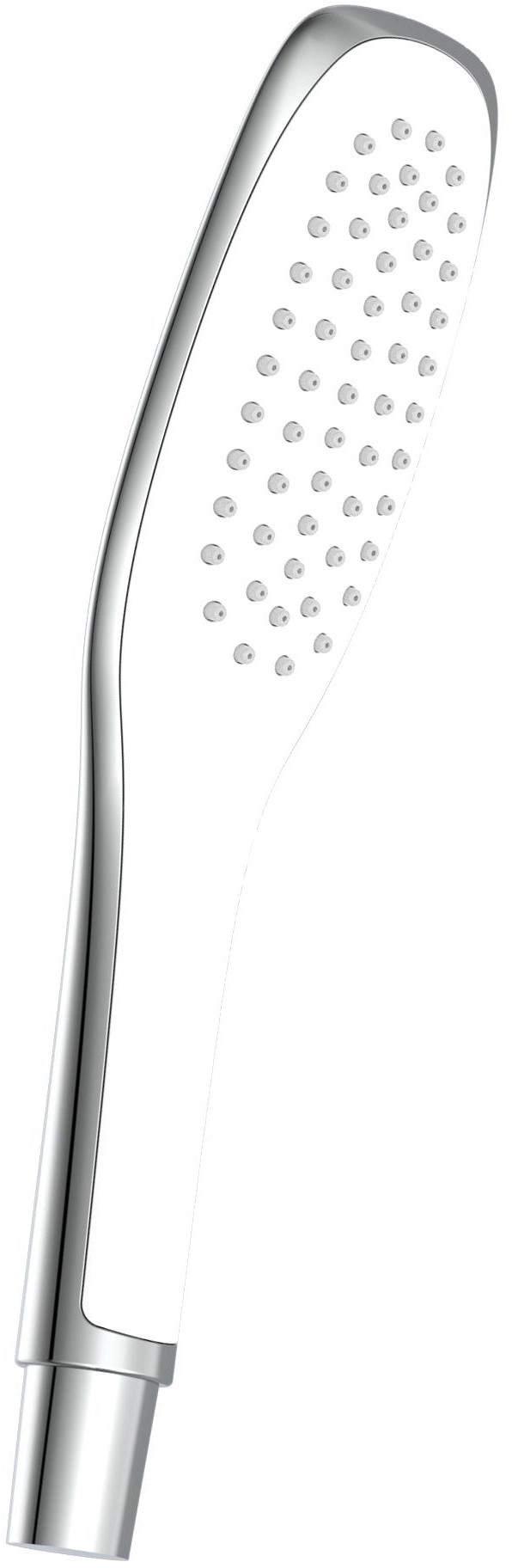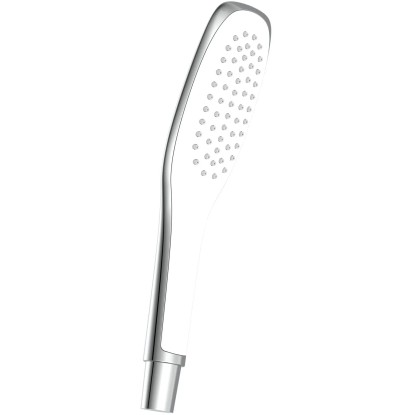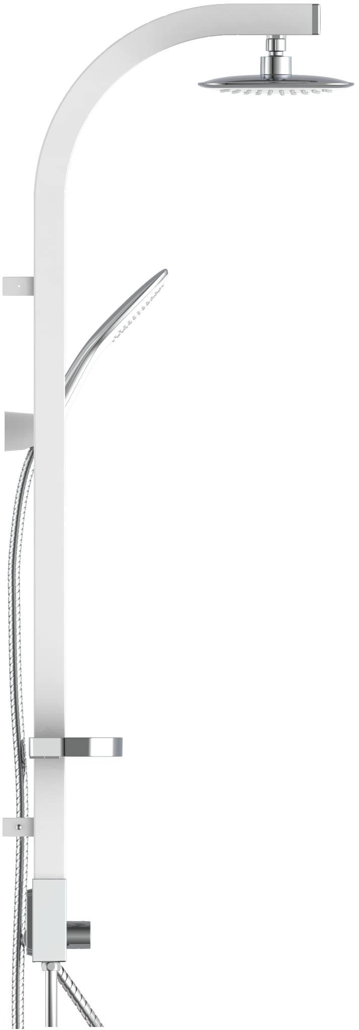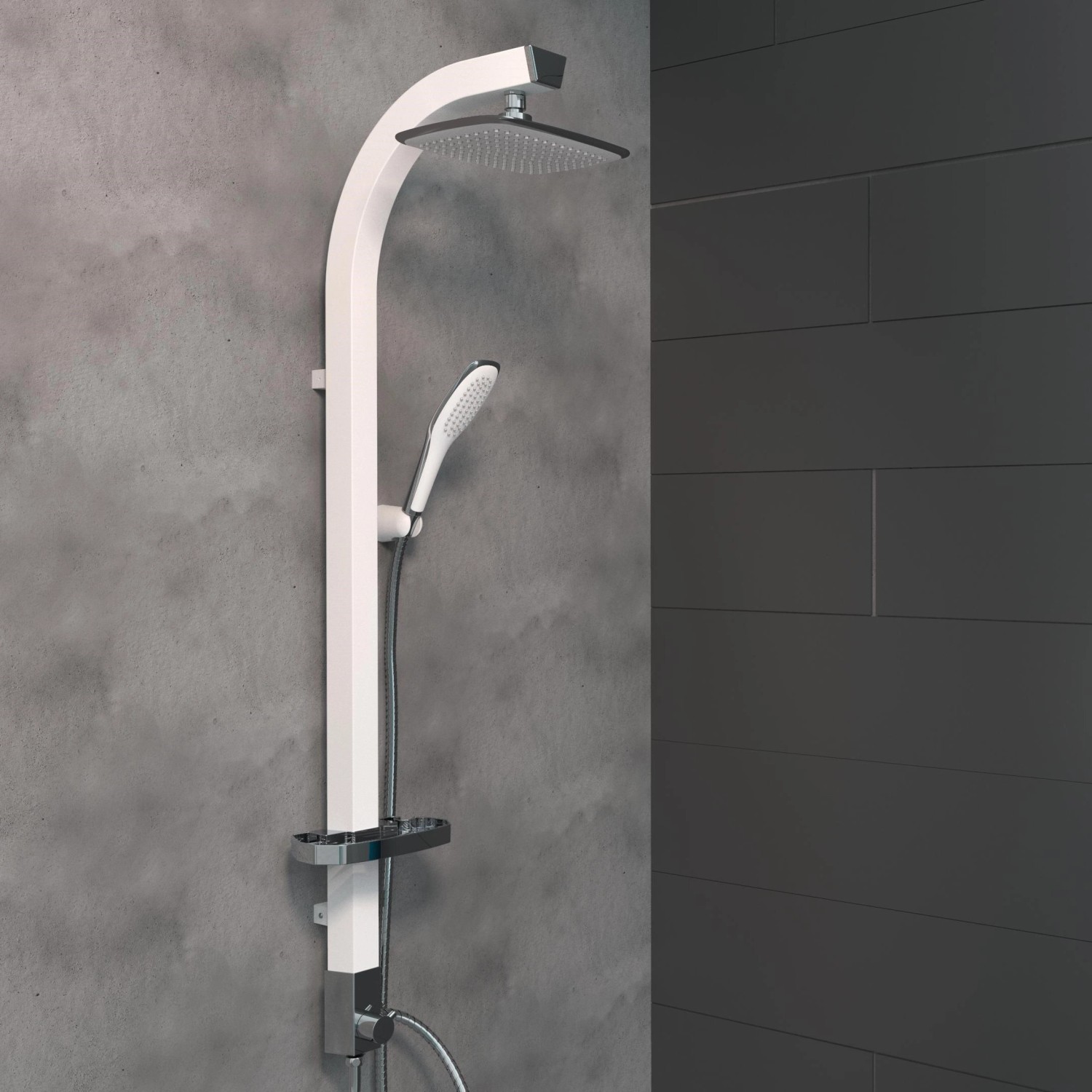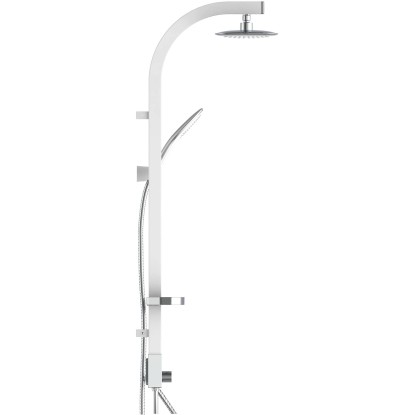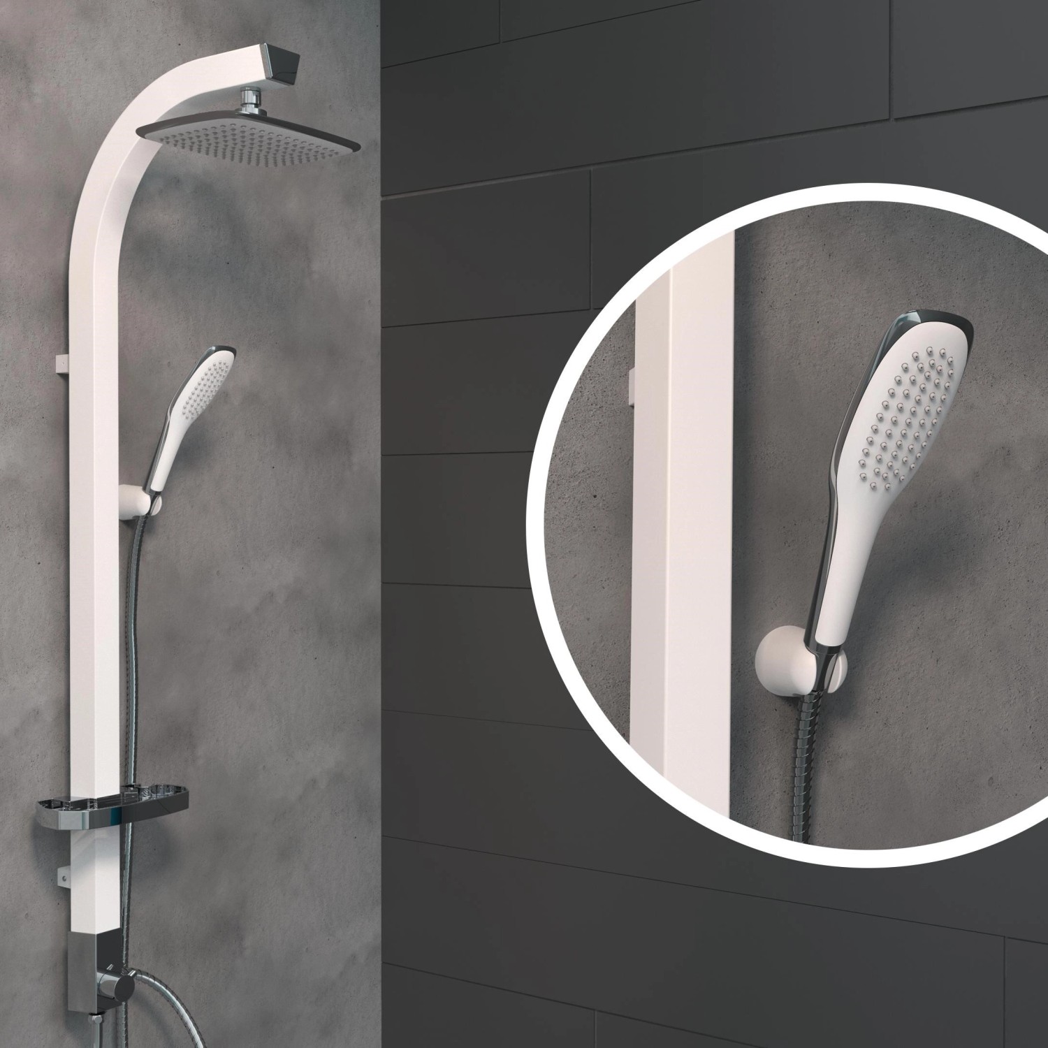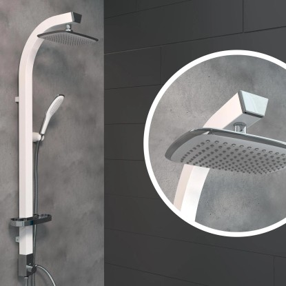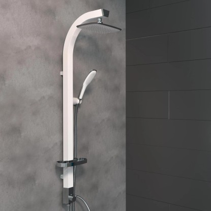 Sprchová tyč z hliníka je celá bielej farby. Detaily, ako prepínač, hlavová sprcha, miska na mydlo a dekoratívne boky, sú pochrómované a dotvárajú celkový vzhľad.