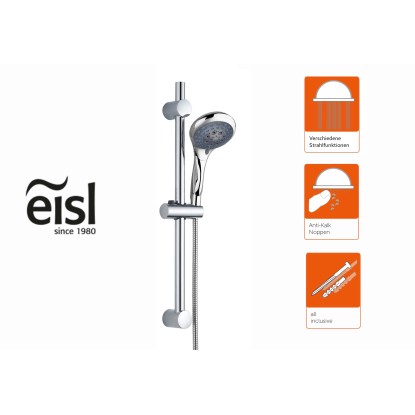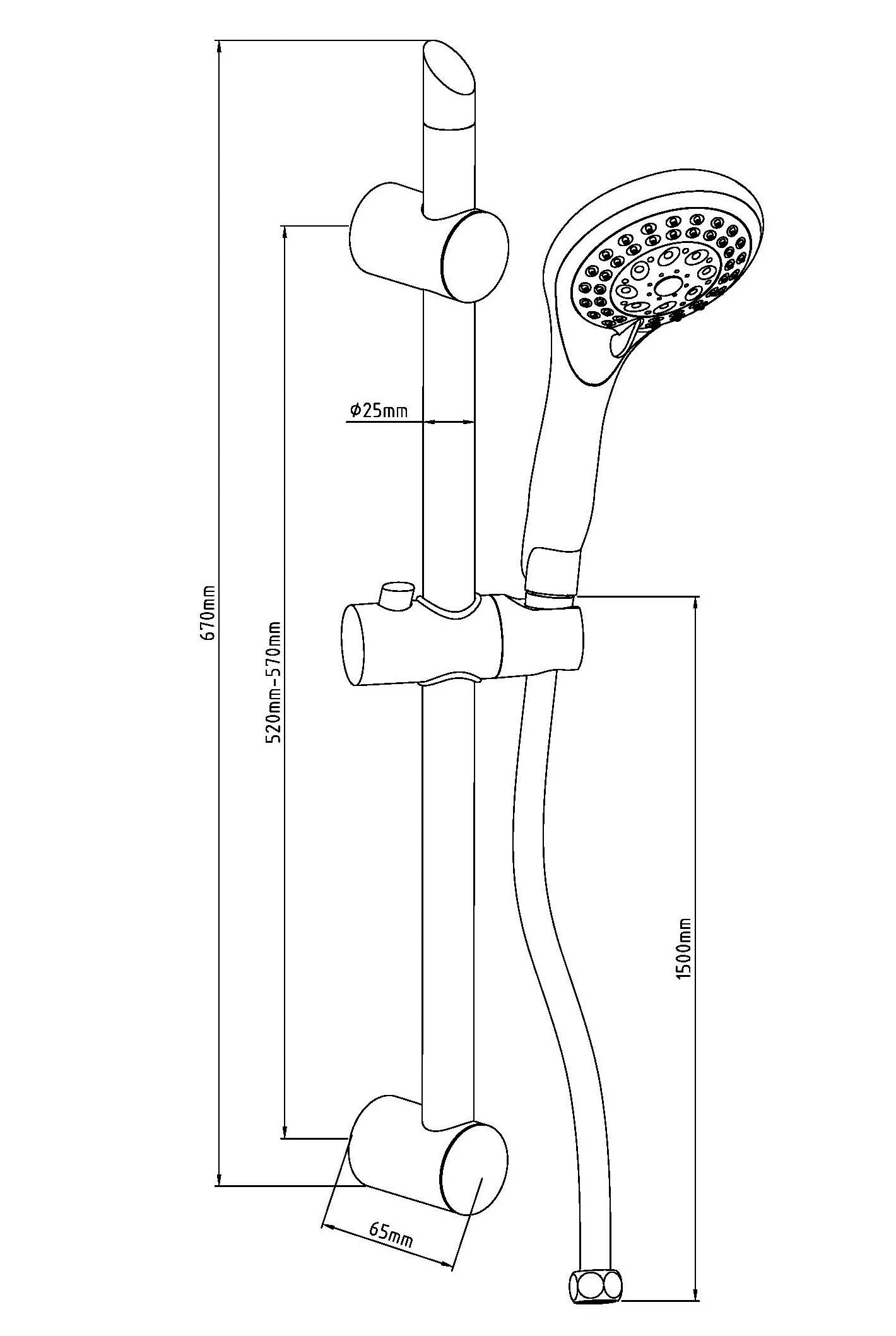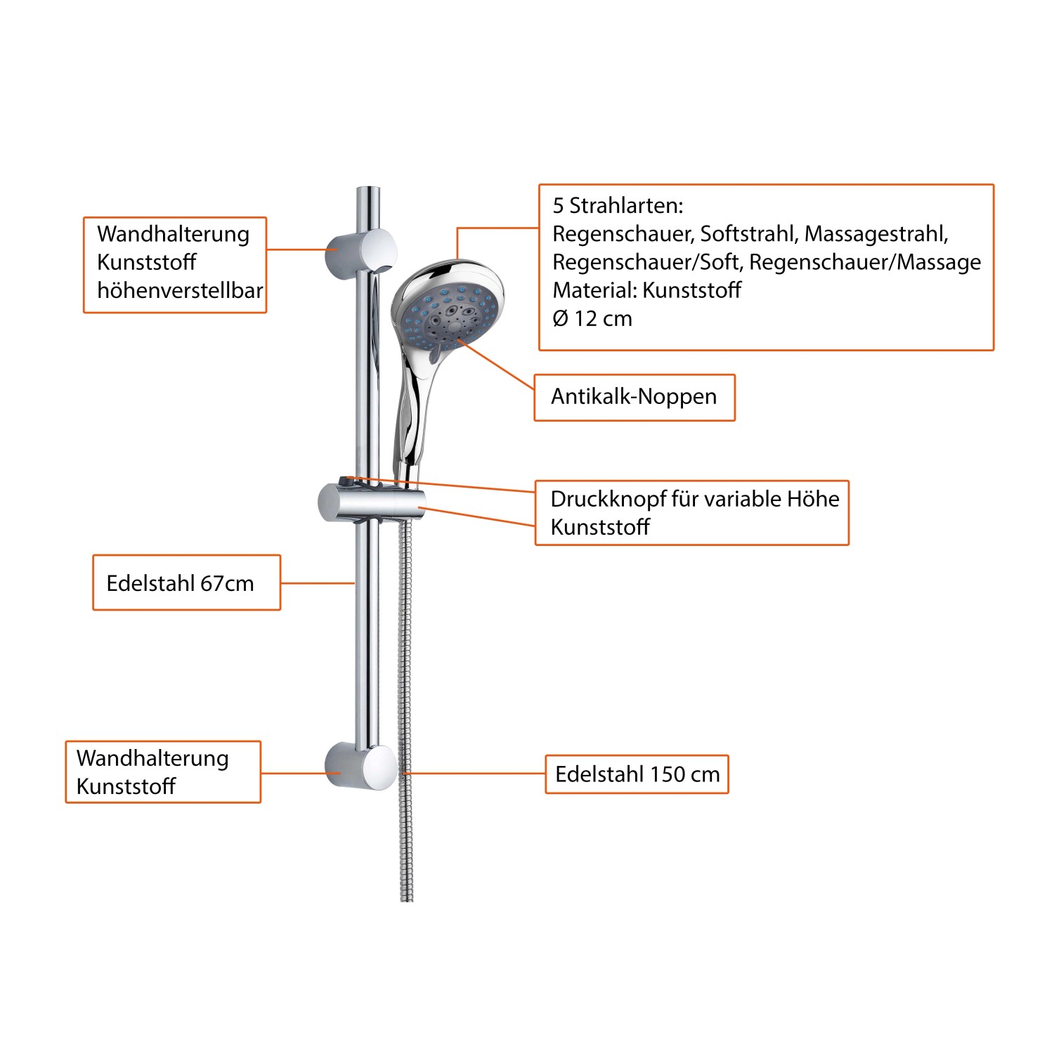 Sprchová hlavica s 5 funkciami je vyrobená z ABS chrómu a jej priemer je 12 cm. Hadica je zhotovená z ušľachtilej ocele, má dvojité vinutie a jej dĺžka je 150 cm. Sprchová tyč je tiež vyrobená z ušľachtilej ocele, jej priemer je 25 mm a na dĺžku meria 67 cm.