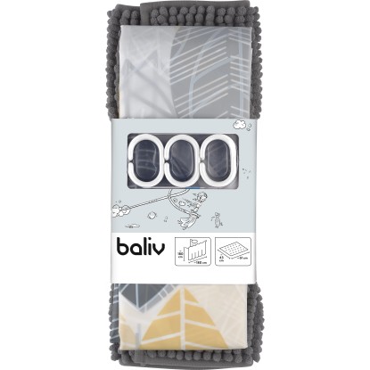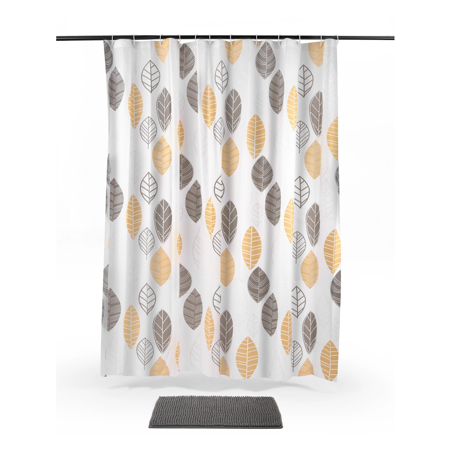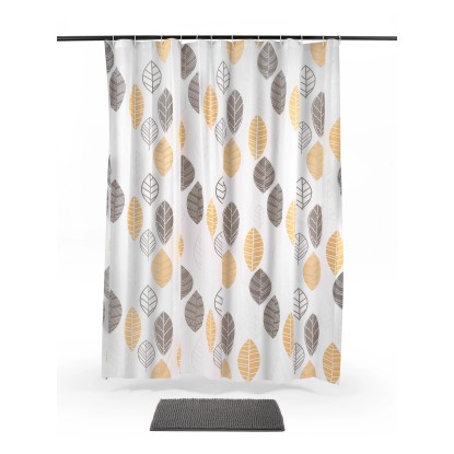Kúpeľňová sada. Sprchový záves z materiálu PEVA 180 cm x 180 cm. Kúpeľňová predložka z žinylky 61 cm x 43 cm.
