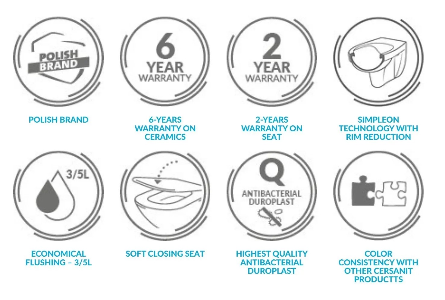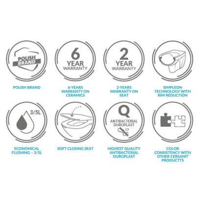 Technológia SimpleON vďaka minimalizovanému okraju výrazne uľahčuje čistenie vnútra toalety ako u klasických toaliet s uzavretým okrajom. Toto riešenie pomáha jednoduchým spôsobom udržiavať hygienu, pretože je tu menej zákutí a štrbín, kde sa môže hromadiť vodný kameň a baktérie. WC disponuje úsporným splachovacím systémom s objemom 3/5 litra.