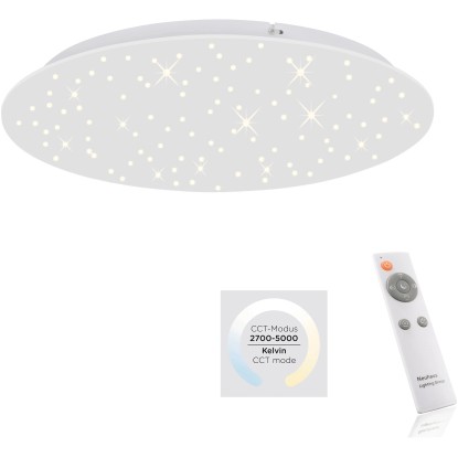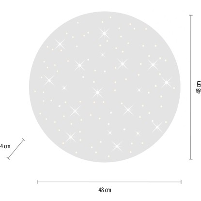 LED stropné svietidlo Just Light. Sparkle presvedčí svojim vzhľadom hviezdnej oblohy a vysokou funkčnosťou. Svietidlo sa dodáva s napevno zabudovaným LED svetelným zdrojom 18 W. LED panel vyžaruje svetelný tok 1 750 lúmenov. Okrem toho môžete meniť farbu svetla od teplej bielej (2 700 K) až po dennú bielu (5 000 K). Táto regulácia sa vykonáva infračerveným diaľkovým ovládaním, ktoré je súčasťou dodávky. Vďaka použitej LED technológii je svietidlo vysoko energeticky úsporné a vyznačuje sa nepatrným zahrievaním a dlhou životnosťou. Svietidlo má dĺžku a šírku 48 cm a zavesenie 4 cm.