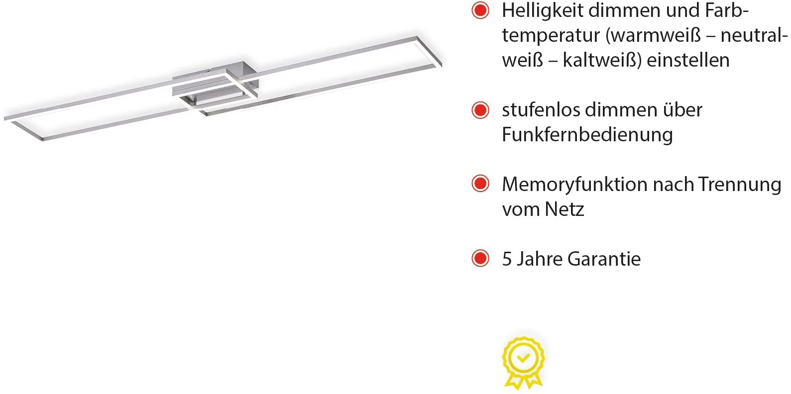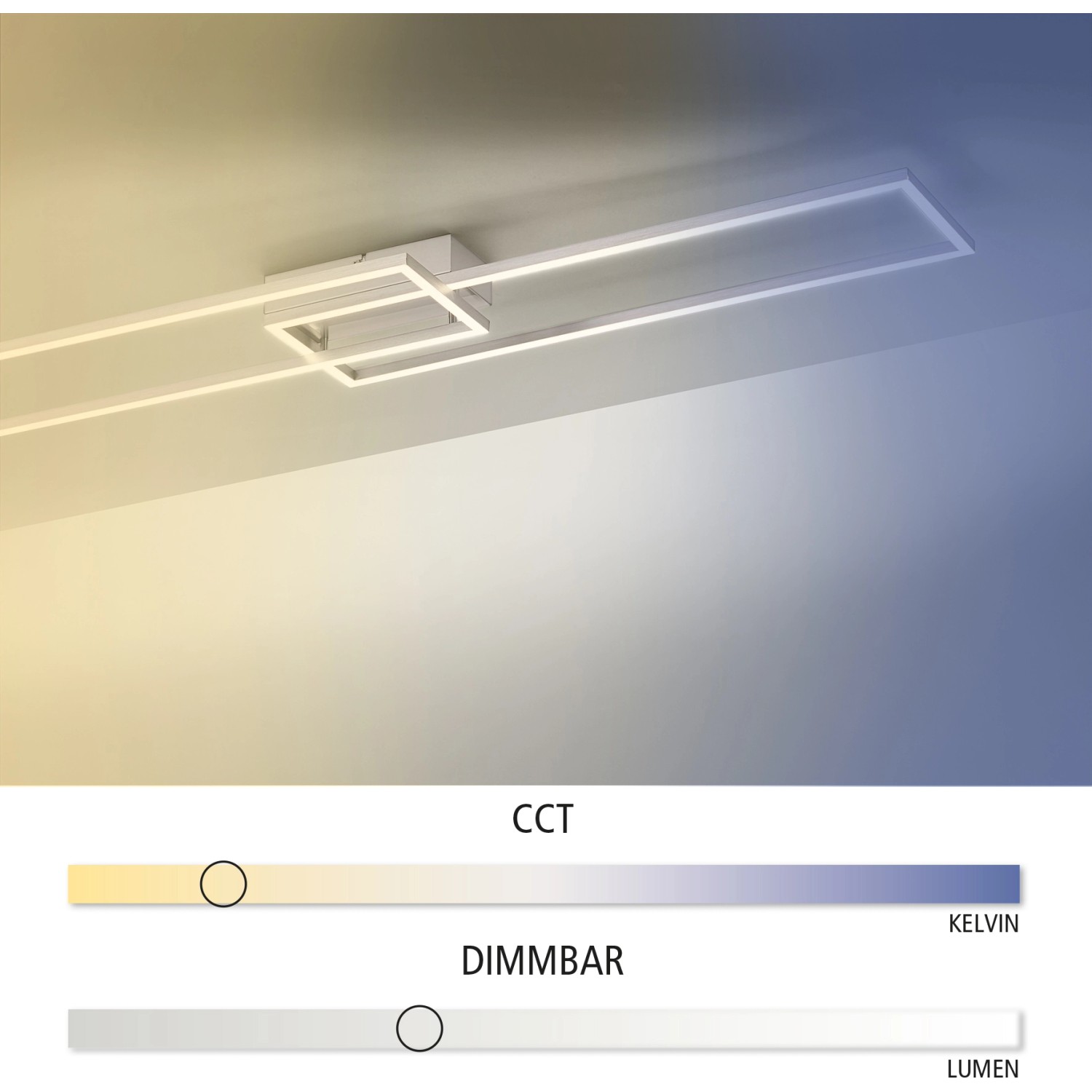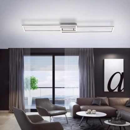 Moderné, ploché stropné svietidlo Iven je vyrobené z ocele a je vybavené dvoma pevne zabudovanými LED žiarovkami s príkonom 20 W. Každý svetelný zdroj vydáva svetelný tok cca 2200 lumenov a teplotu chromatickosti svetla je možné nastaviť od 2 700 K (teplá biela) do 5 000 K (neutrálna biela). Svietidlo sa ovláda infračerveným diaľkovým ovládaním, ktoré je súčasťou dodávky. Celkový merný svetelný tok svietidla je 1920 lumenov. Pomocou diaľkového ovládania je možné plynule regulovať aj intenzitu osvetlenia. Stropné svietidlo je vybavené pamäťovou funkciou, takže posledné nastavenie svietidla zostane uložené aj po vypnutí svietidla a pri opätovnom zapnutí sa svietidlo práve v tomto režime rozsvieti. Rozmery: 110 x 25 x 7 cm.