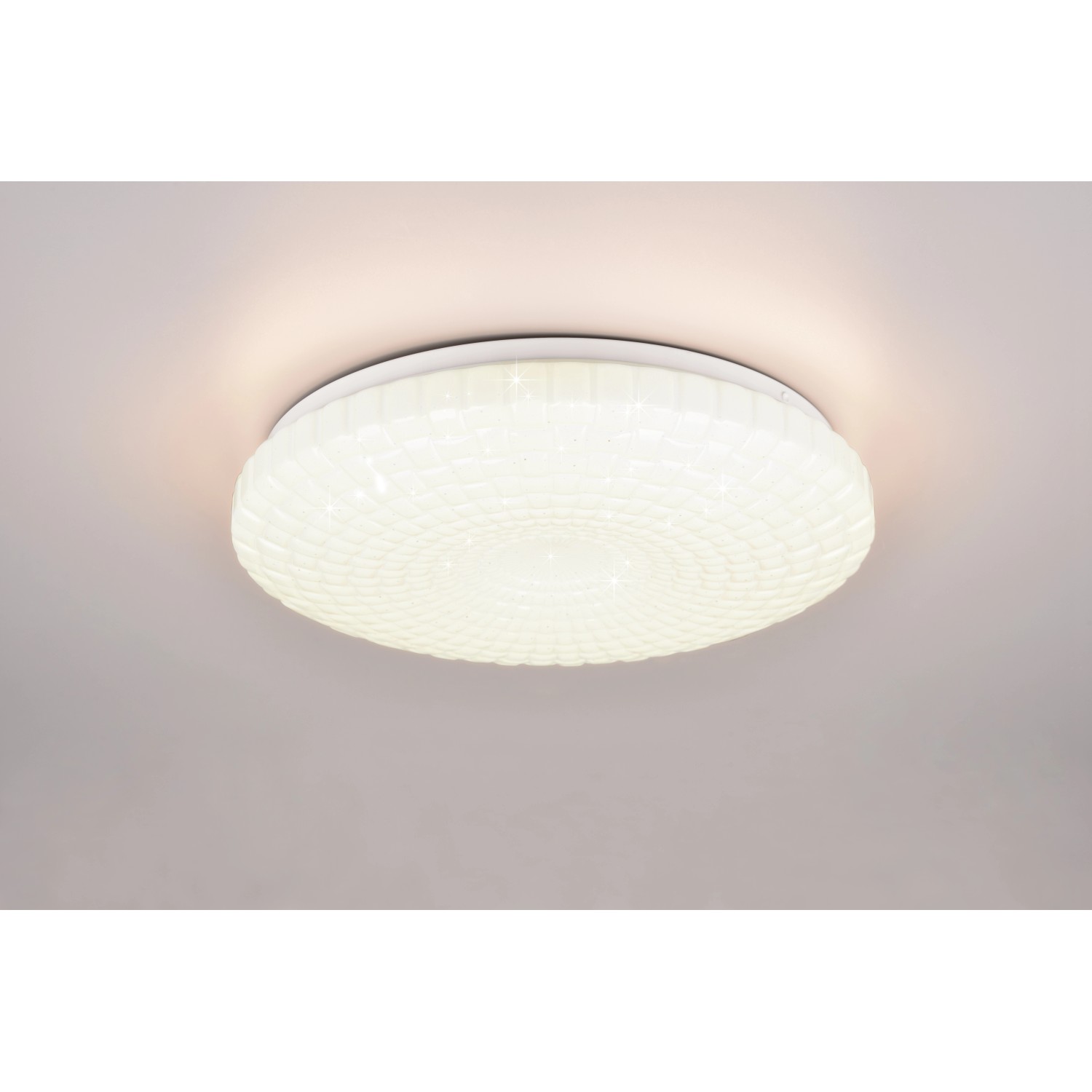 Stropné/nástenné svietidlo Reality Vega s efektom hviezdnej oblohy je vybavené pevne zabudovanou SMD LED žiarovkou s príkonom 16 W a vyžaruje svetlo so svetelným tokom 1900 lm a teplotou chromatickosti 3000 K (teplá biela).