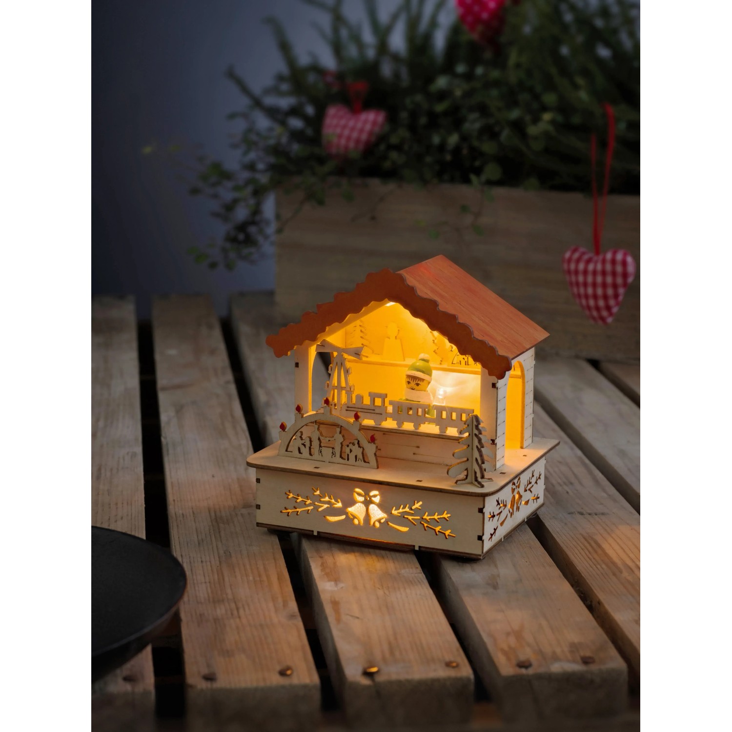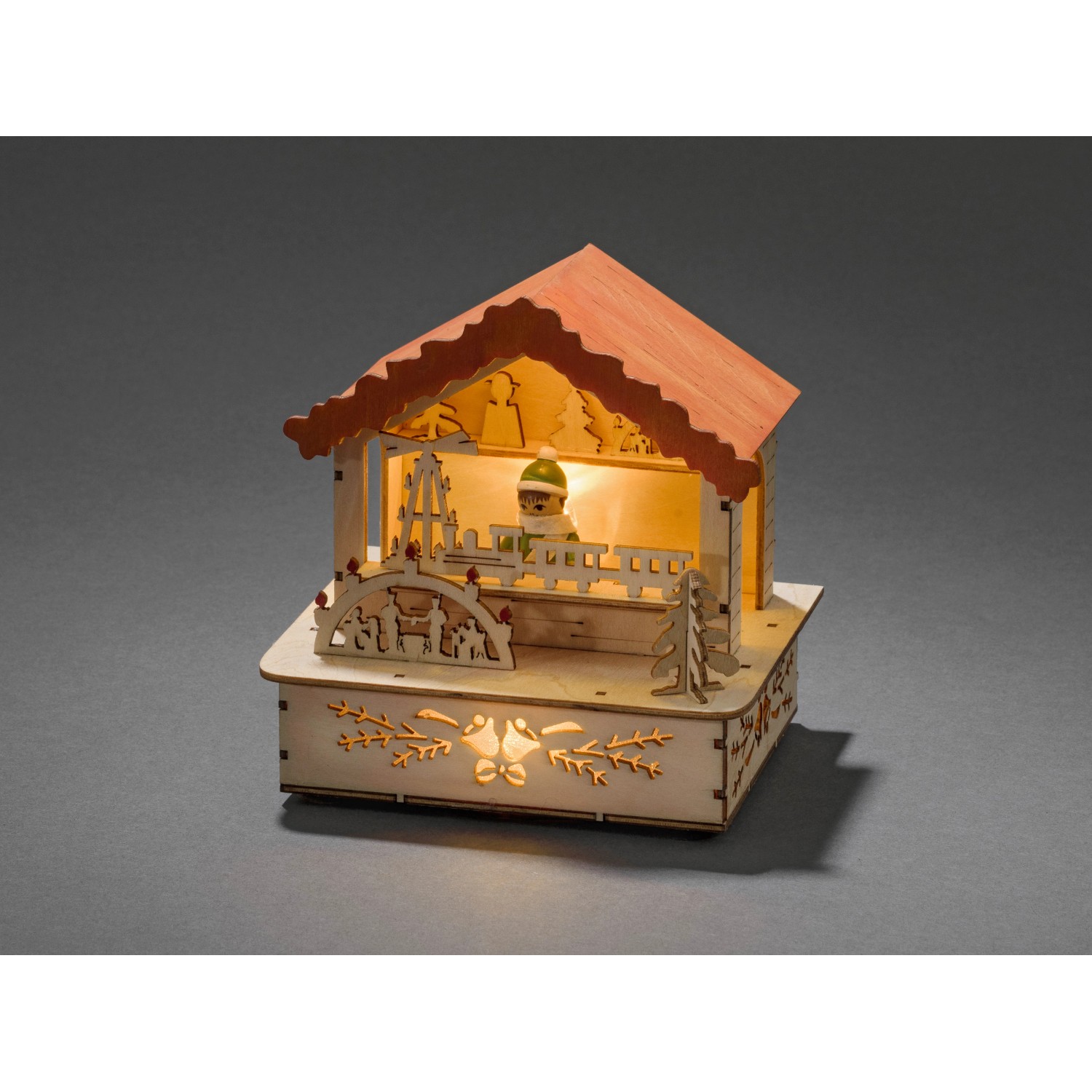LED drevená silueta predajného stánku s oranžovou strechou vnesie do príbytku vianočné trhy. Je v prírodných farbách a osvetlená 3 diódami s teplým bielym svetlom.