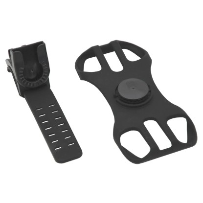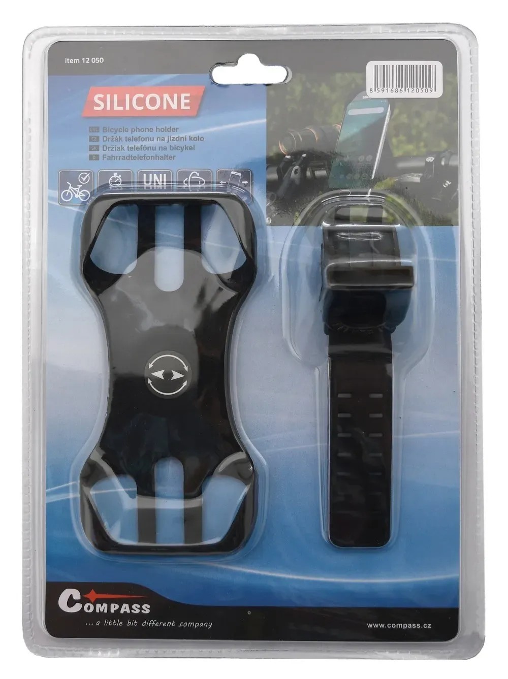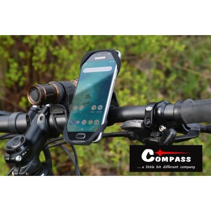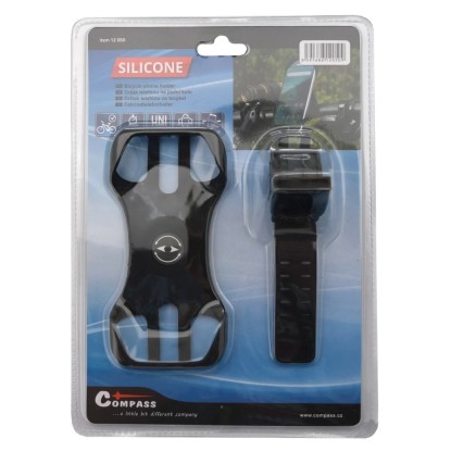 Silikónový držiak telefónu od firmy Compass s nastaviteľným pozorovacím uhlom. Jednoduchý mechanizmus umožňuje rýchle sňatie telefónu z držiaka. Silikónové prevedenie zaisťuje, že držiak nekĺže po trubke riadidiel, odoláva otrasom a vďaka tomu je minimalizované trepanie umiestneného telefónu počas jazdy. Držiak je vhodný na uchytenie telefónov s uhlopriečkou displeja až 7". Je vhodný na upevnenie na štandardnú rúrku riadidiel bicykla pomocou pevnej gumovej pracky so 7 vylisovanými polohami na bezpečné zaistenie.