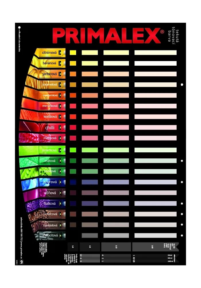 Primalex tekutá tónovacia farba je rad univerzálnych akrylátových tónovacích farieb v 18 vybraných odtieňoch určených na zafarbovanie maliarskych náterových hmôt. Odtiene sú pripravené na okamžité použitie pre jednoduché a rýchle namiešanie. Je tiež možné ich vzájomne kombinovať a docieliť tak bohatú škálu ďalších farebných odtieňov alebo ich aplikovať aj priamo vo forme koncentrátu.