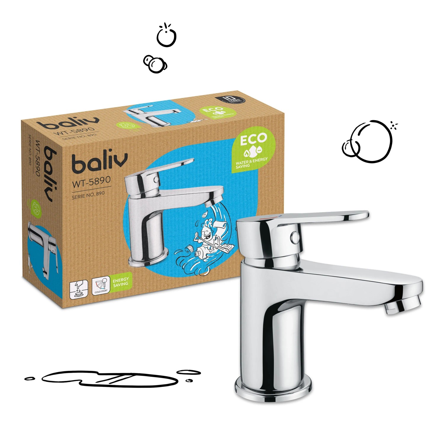 Umývadlová páková batéria baliv WT-5890Táto umývadlová stojanková páková batéria je vďaka svojmu univerzálnemu a elegantnému vzhľadu vhodná do každej kúpeľne. Vďaka funkcii studeného štartu a maximálnemu prietoku 7,3 l/min pri tlaku 1,5 bar pomáha batéria šetriť vodu a energiu.
