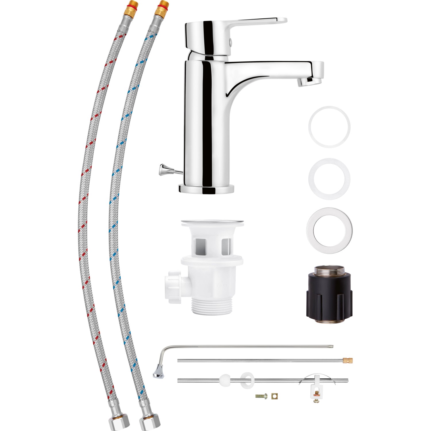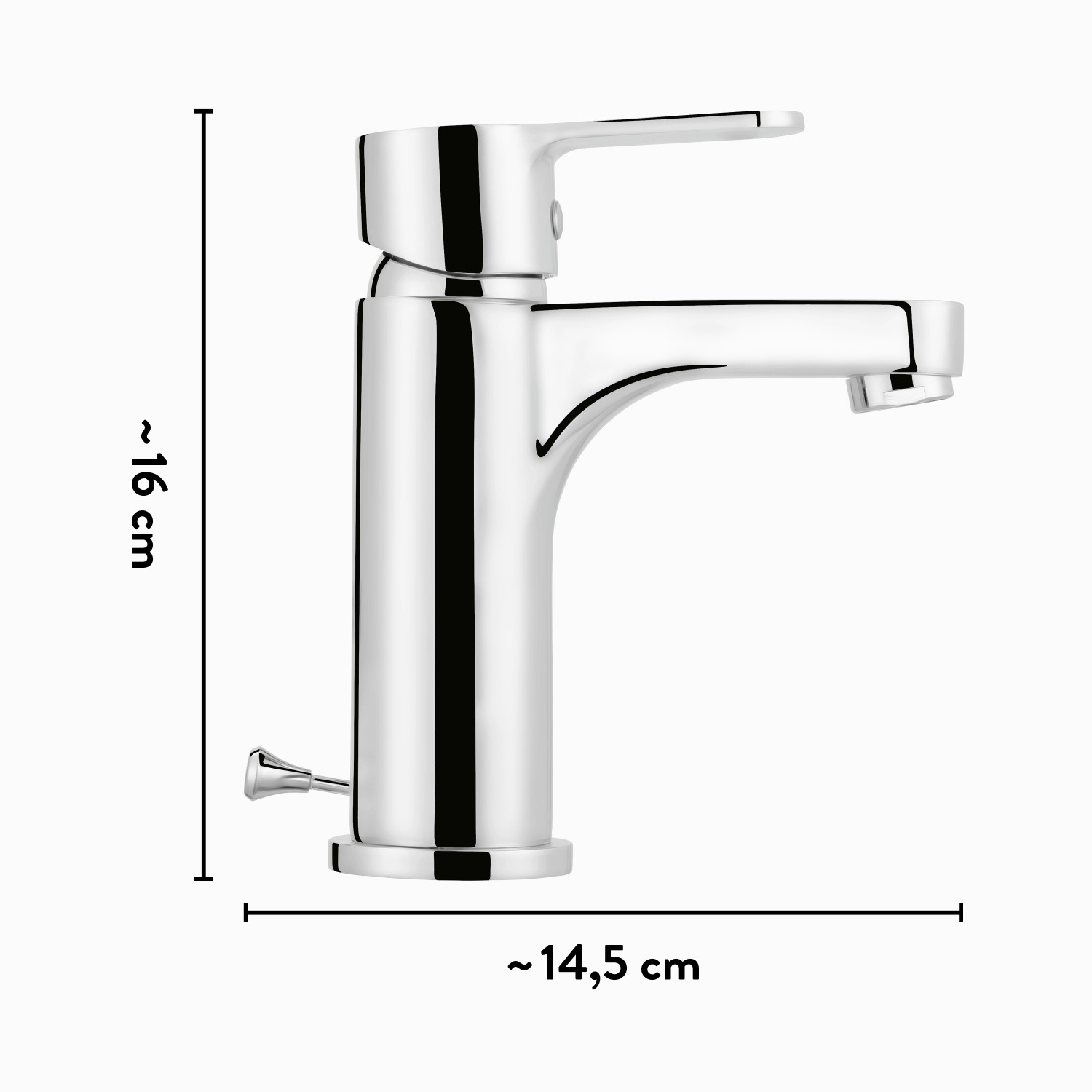 Jednopáková zmiešavacia batéria z pochrómovanej mosadze má zmiešavaciu trysku, ktorá vytvára mäkký prúd vody primiešavaním vzduchu. Kvalitnú kartušu môžete vymeniť. Vďaka keramickým tesniacim podložkám je ovládanie jemné a tiché. Pomocou dvoch pripojovacích hadíc, ktoré sú súčasťou balenia, sa batéria namontuje na umývadlo. Hadice zodpovedajú aktuálnemu nariadeniu o pitnej vode. Súčasťou balenia je aj odtoková armatúra s excentrom.