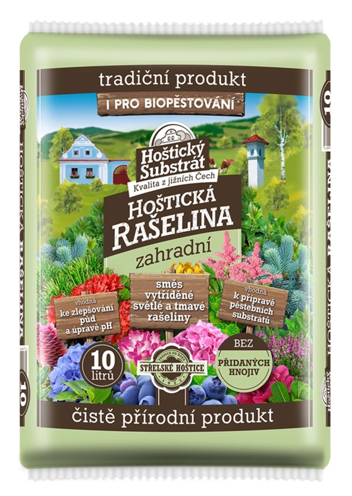 Hoštická rašelina záhradná je zmes vytriedenej svetlej a tmavej rašeliny. Je vhodná na zlepšovanie záhradných pôd, na ich prevzdušňovanie, odľahčovanie a úpravu pH. Umožňuje dobrý rast a bohatú tvorbu koreňov. V pôde zadržiava vlahu a chráni rastliny pred vysychaním. Tým, že obohacuje pôdu o organické látky, zlepšuje zadržiavanie živín pre rastliny a zamedzuje ich vyplavovaniu do spodných vôd. Ide o čisto prírodný produkt, nemá upravené pH a nemá pridané živiny. Balenie: 10 l.