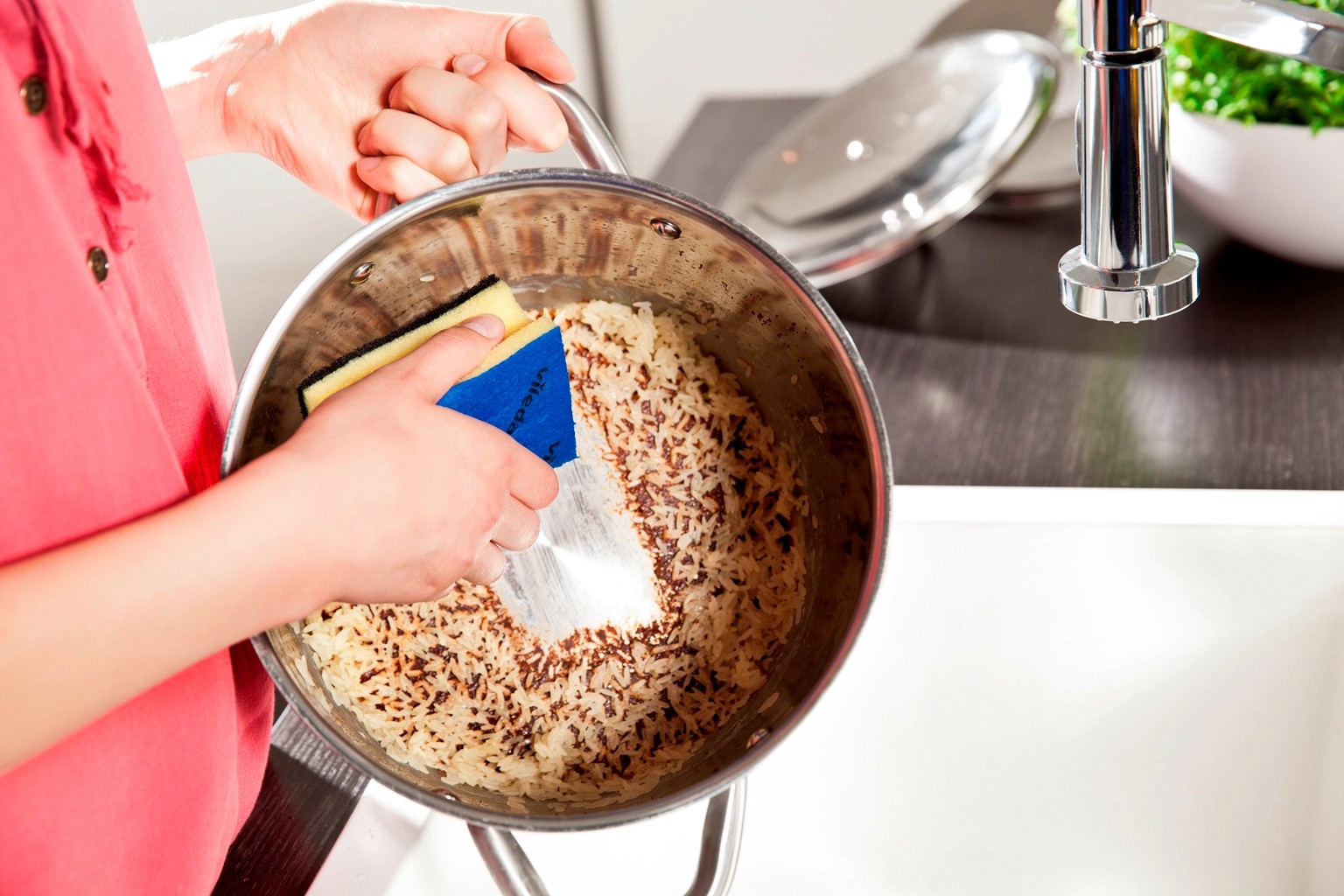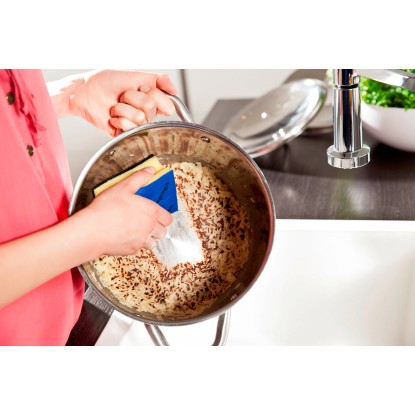 Veľmi kvalitná hubka s chráničom nechtov. Pevná a tvrdá drôtenka s čistiacimi kryštálmi. Ideálna na umývanie a odstraňovanie pripálených nečistôt na bežnom riade. Rastu baktérií je z 99,9 % zabránené vďaka zloženiu časti hubky určenej pre drhnutie. Spodná strana hubky je vybavená hubovou handričkou, pre zabezpečenie zvýšenej schopnosti absorpcie tekutín alebo jemného umývania. Abrazívny materiál pre dôkladné čistenie s antibakteriálnym účinkom.
