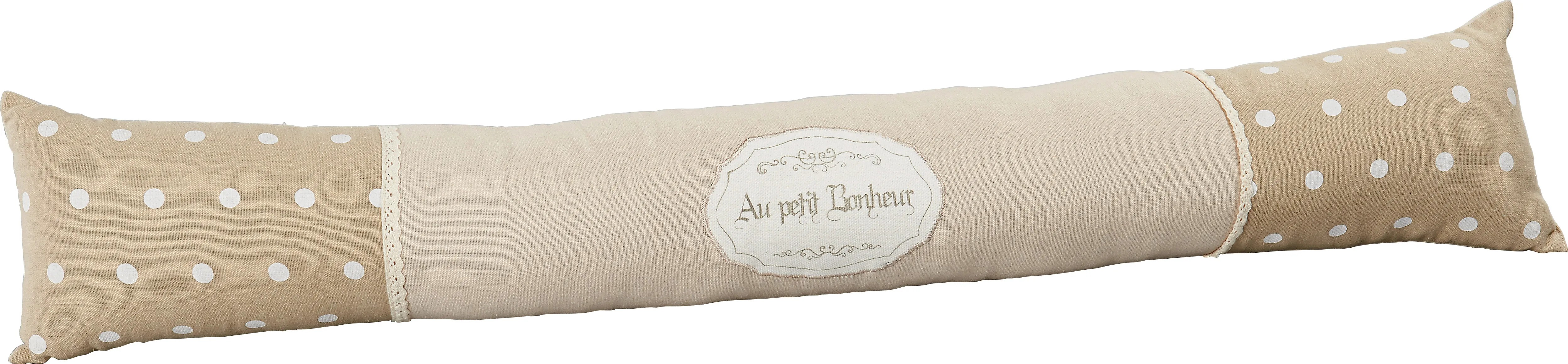 Na dekoratívnej dverovej clone proti prefukovaniu je vyšitý nápis "Au petit bonheur" a tým, že zabráni prefukovaniu popod krídlo dverí, spríjemní klímu vo vašom byte. Skladá sa z 30 % ľanu a 70 % polyesteru a jej náplň zo 100 % polyesteru zaručí dobré utesnenie.