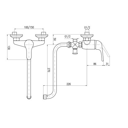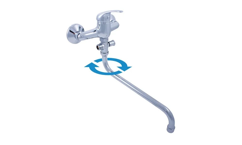 Vodovodná batéria pre vaňu a umývadlo nástenná s guľatým ramienkom. Táto batéria je vybavená keramickou kartušou o priemere 35 mm (KA3502E). S ramienkom s dĺžkou 29 cm (SR0200E), perlátorom (MA002E) a prepínačom (MD0007). Rozteč batérie 150 mm.