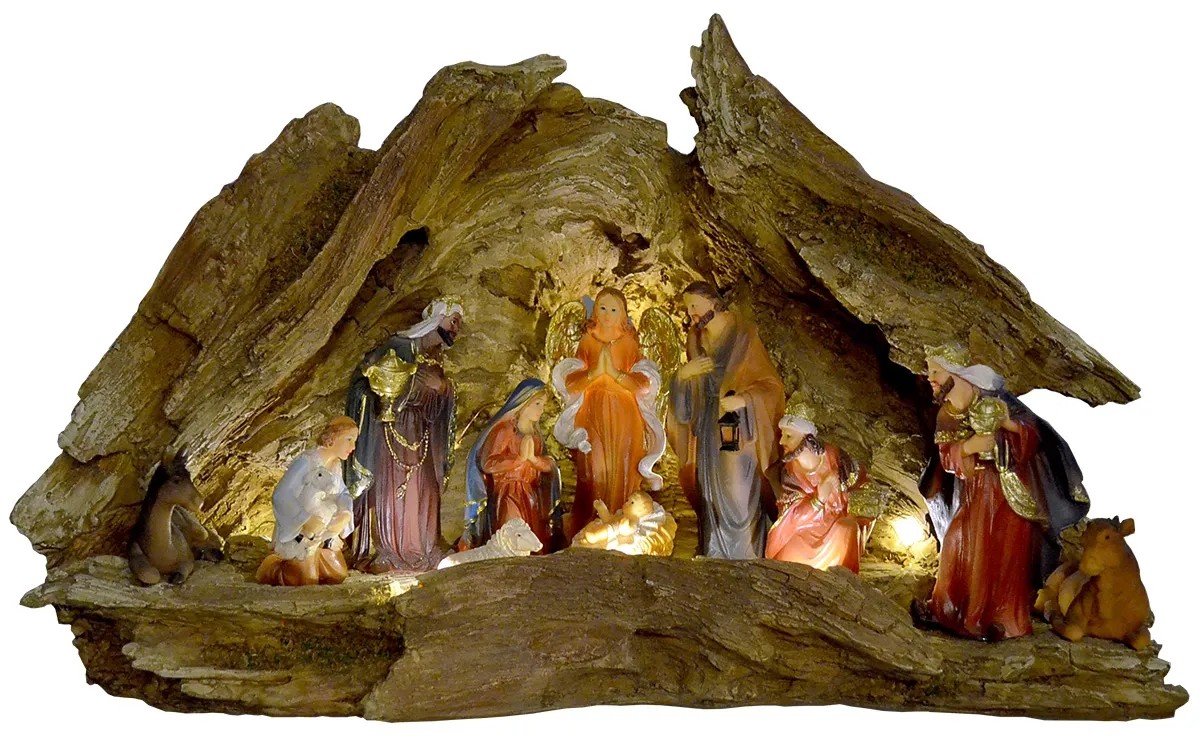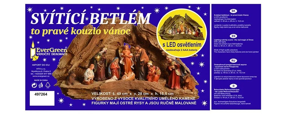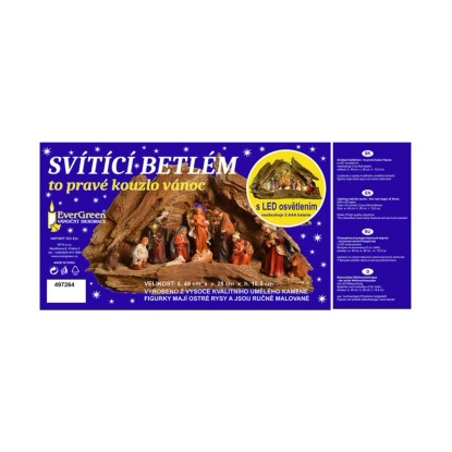 Svietiaci betlehem, to pravé kúzlo Vianoc. Vyrobené z vysoko kvalitného umelého kameňa. Figúrky majú ostré rysy a sú ručne maľované. Balenie neobsahuje batérie, nutné dokúpiť 2 AAA batérie.