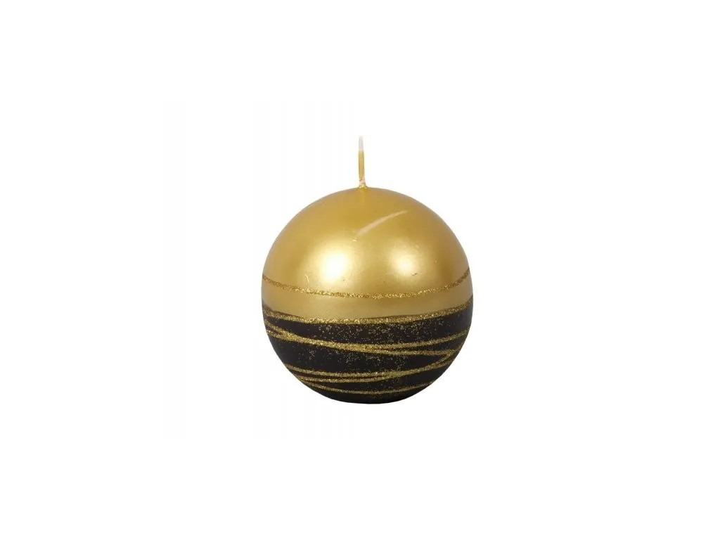Vianočná sviečka v tvare gule napoly čierna a napoly zlatá zdobená v strede zlatými glitrovými prúžkami. Výška: 8 cm.