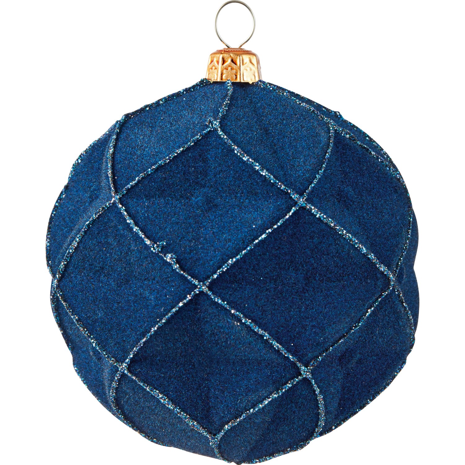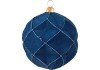 Jednotlivá vianočná guľa predstavuje individuálny dekoratívny prvok na zimné obdobie. Dá sa univerzálne použiť ako stolná dekorácia alebo ozdobí vianočný stromček. Vianočná ozdoba upúta pozornosť svojím moderným fazetovým tvarom s vysokými švami. Guľa je pomaľovaná tmavo modrou farbou. Je vyrobená z plastu a je potiahnutá semišom. Má matný povrch s trblietavými hranami. Priemer je 8 cm. Pre ľahké zavesenie je integrovaná zlatá korunka s okom.