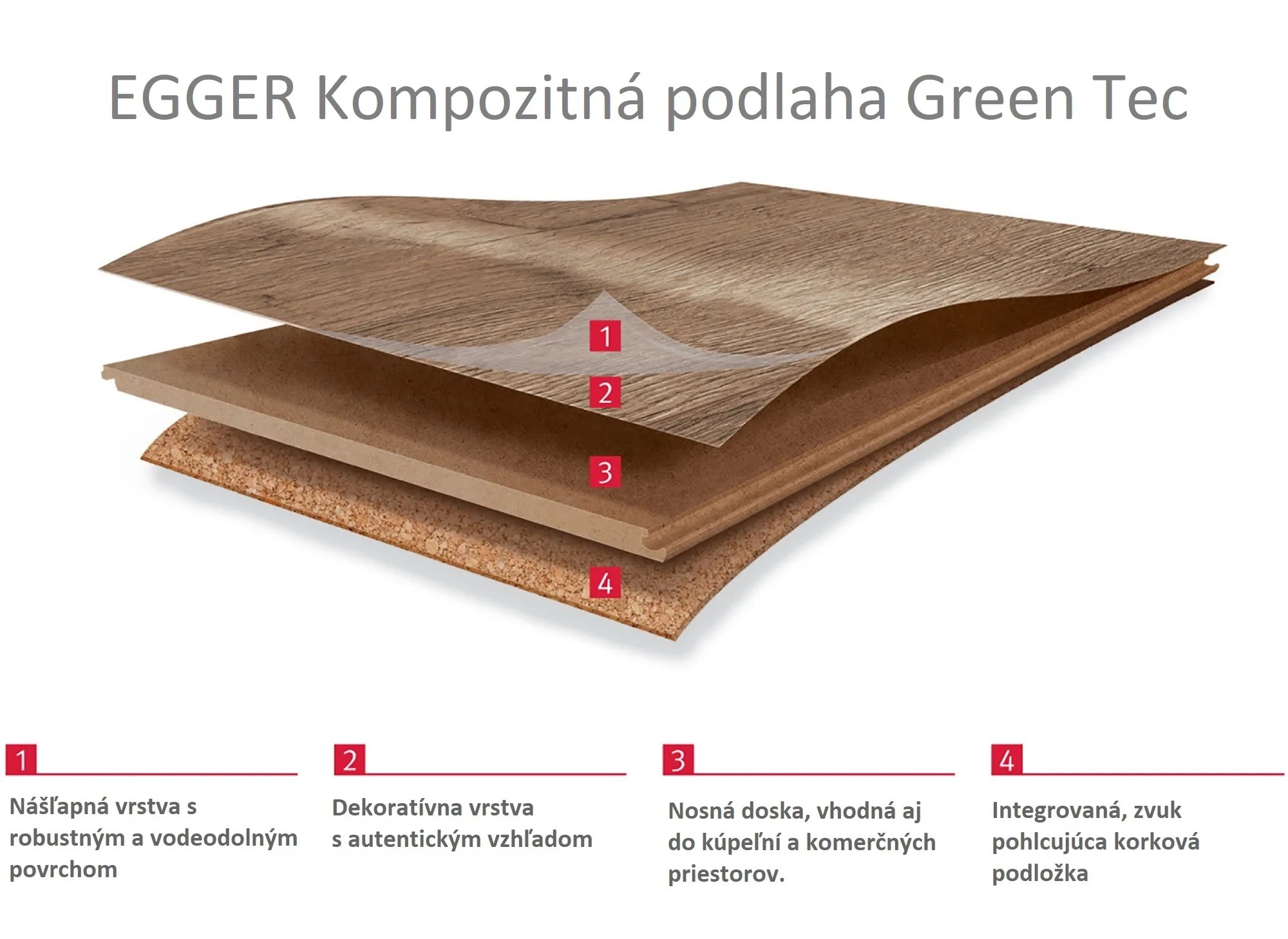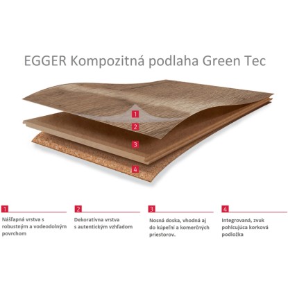 Štýlový dizajn a vysoká odolnosť! To sú podlahy Egger Design GreenTec, ktoré spájajú komfort bývania s požiadavkami na funkčnosť a poskytujú príjemný pocit vďaka využitiu prírodných ekologických materiálov. Oproti bežným LVT a vinylovým podlahám neobsahujú vôbec žiadne PVC, škodlivé látky a zmäkčovadlá a zo 67 % sú vyrobené z obnoviteľných surovín. Použité drevo pochádza zo 100% z regionálnych certifikovaných lesov. Integrovaná zvuková izolácia je vyrobená z recyklovaného korku.