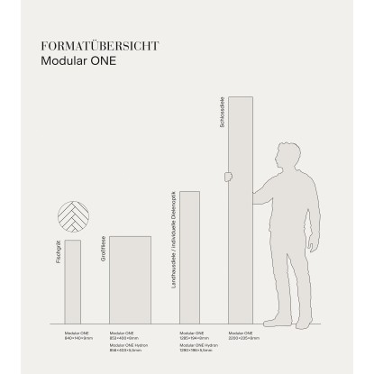 Vodeodolný povrch a kompozitná nosná doska vhodná do vlhkých miestností robí z podlahy Modular ONE skutočného všestranného pomocníka, ktorého je možné položiť aj do vlhkých miestností, ako je kúpeľňa. Špeciálne spracovanie hrán navyše chráni podlahu pred vnikaním vody.