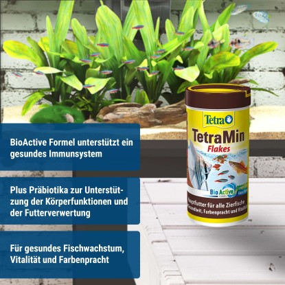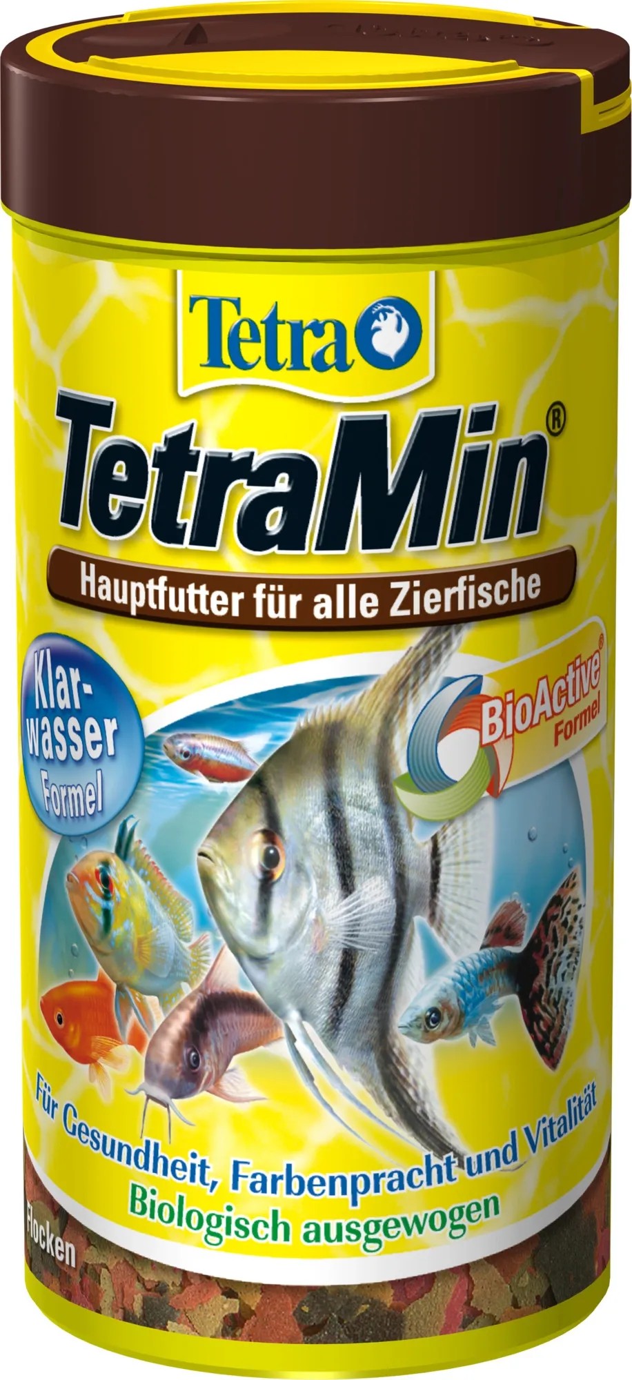 Tetra Min je kompletné krmivo pre akváriové ryby. Obsahuje 40 starostlivo vybraných, vysoko kvalitných surovín zabezpečujúcich príjem všetkých významných živín, vitamínov a stopových prvkov. Posilňuje obranyschopnosť živočíchov, pozitívne ovplyvňuje stavbu kostry a pomáha rýchlejšiemu rastu. Obsahuje stabilné množstvo vitamínu C.