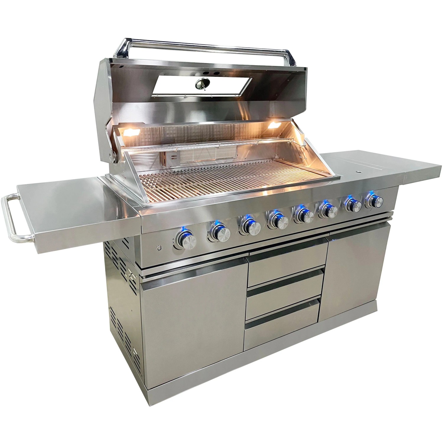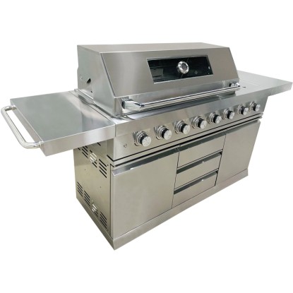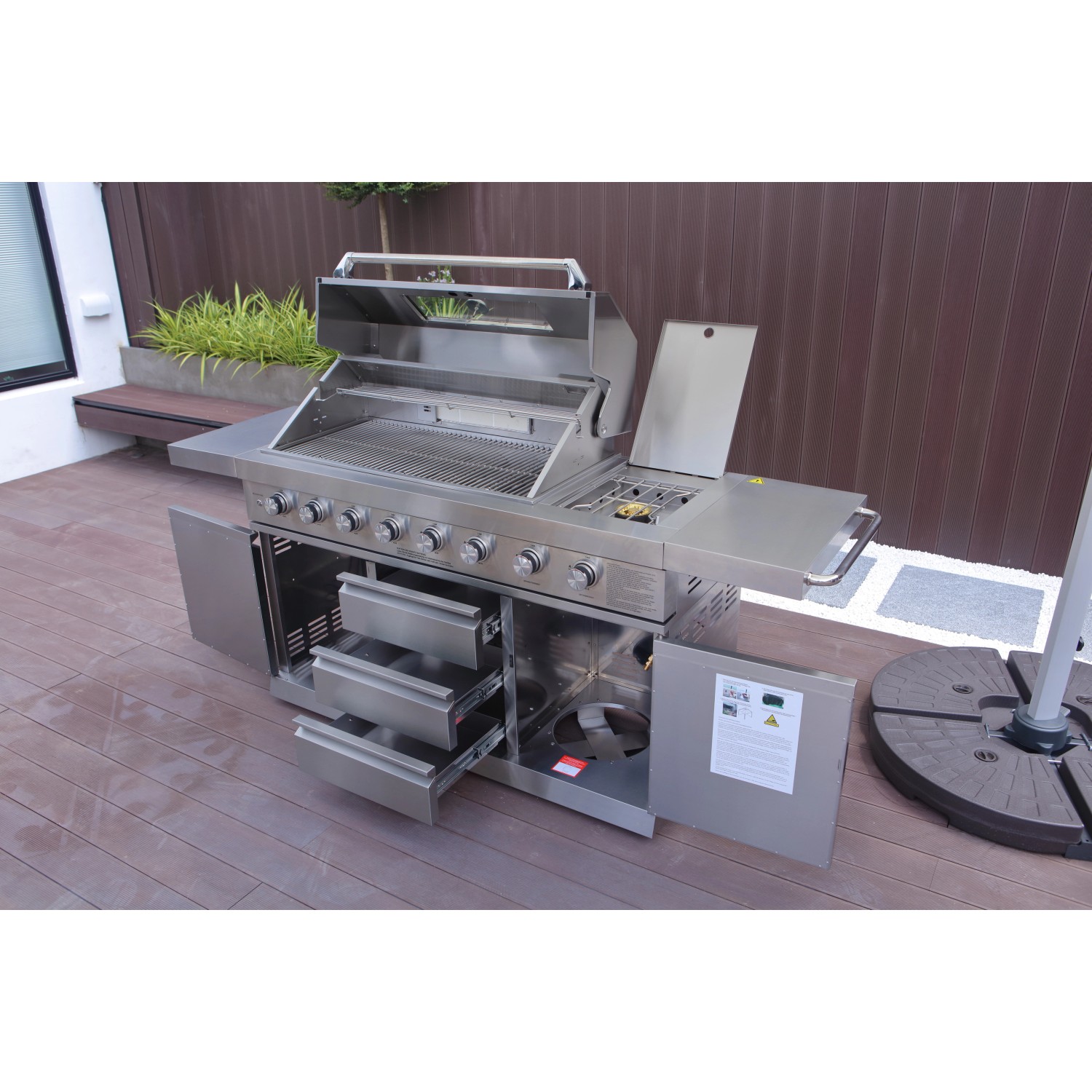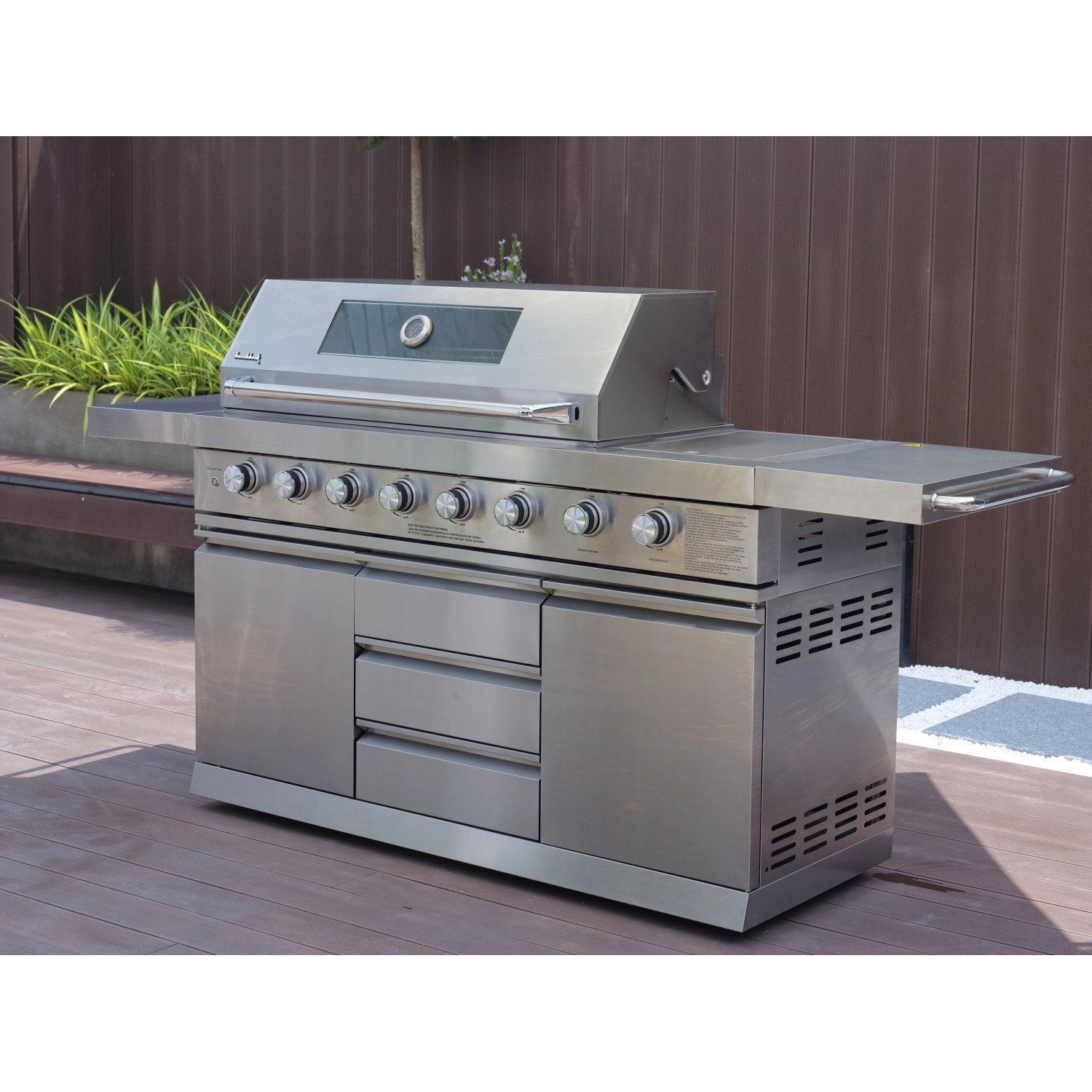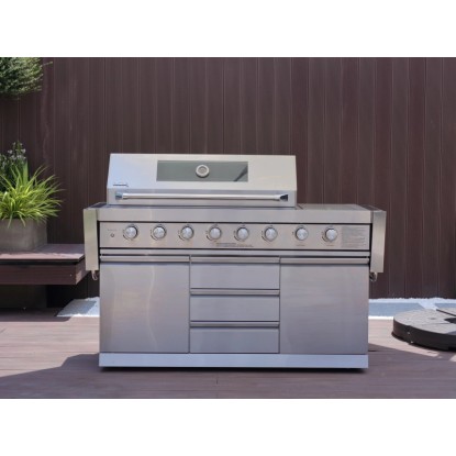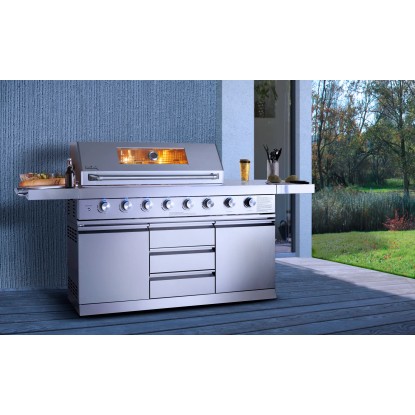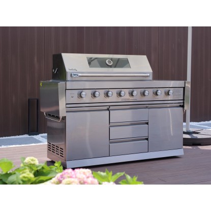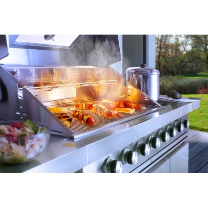 Šesť výkonných nerezových horákov je možné ovládať samostatne a ponúka tak možnosť grilovať priamo alebo nepriamo. Teplomer integrovaný do krytu grilu vám umožní mať nad grilovaným jedlom plnú kontrolu a na praktickom bočnom sporáku je možné pripraviť vhodné prílohy, polievky alebo omáčky. Priestranné pracovné plochy ponúkajú dostatok priestoru na prípravu jedla av prípade potreby ich možno zmenšiť pre úsporu miesta pomocou dvoch výklopných políc na boku. Hrnce, dosky, grilovacie príbory atď. je možné uložiť do dvoch spodných skriniek a troch zásuviek a sú tak vždy rýchlo po ruke. Pripojovacia hadica a regulátor tlaku plynu sú súčasťou dodávky.