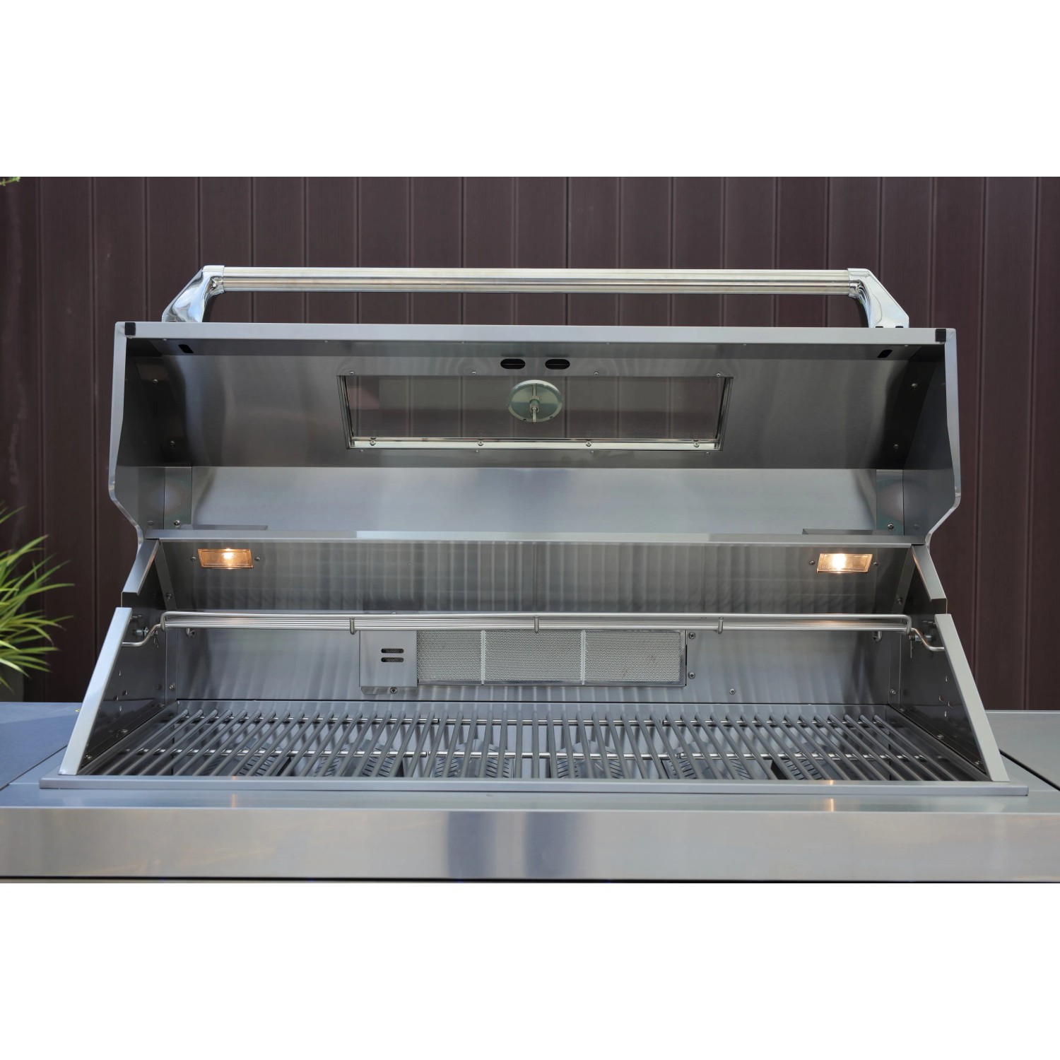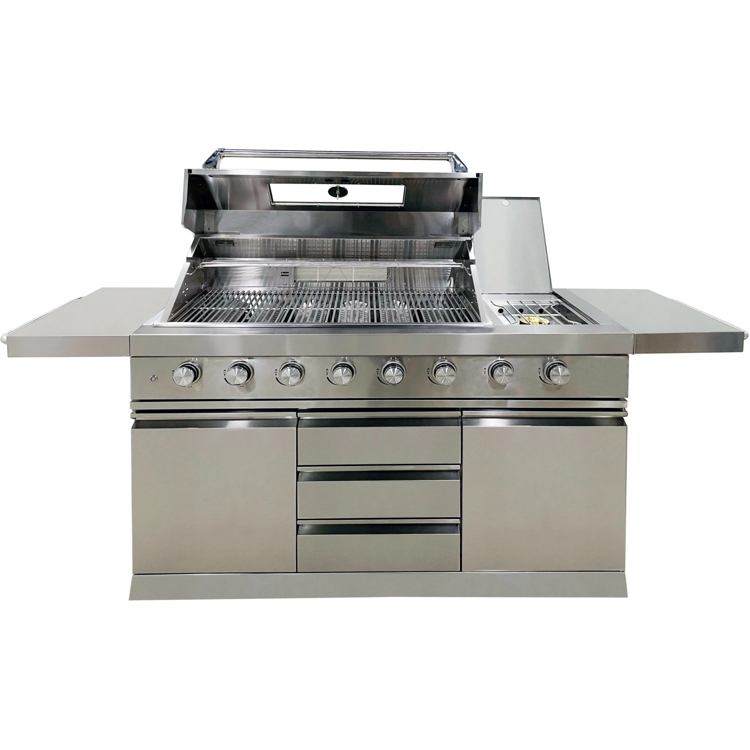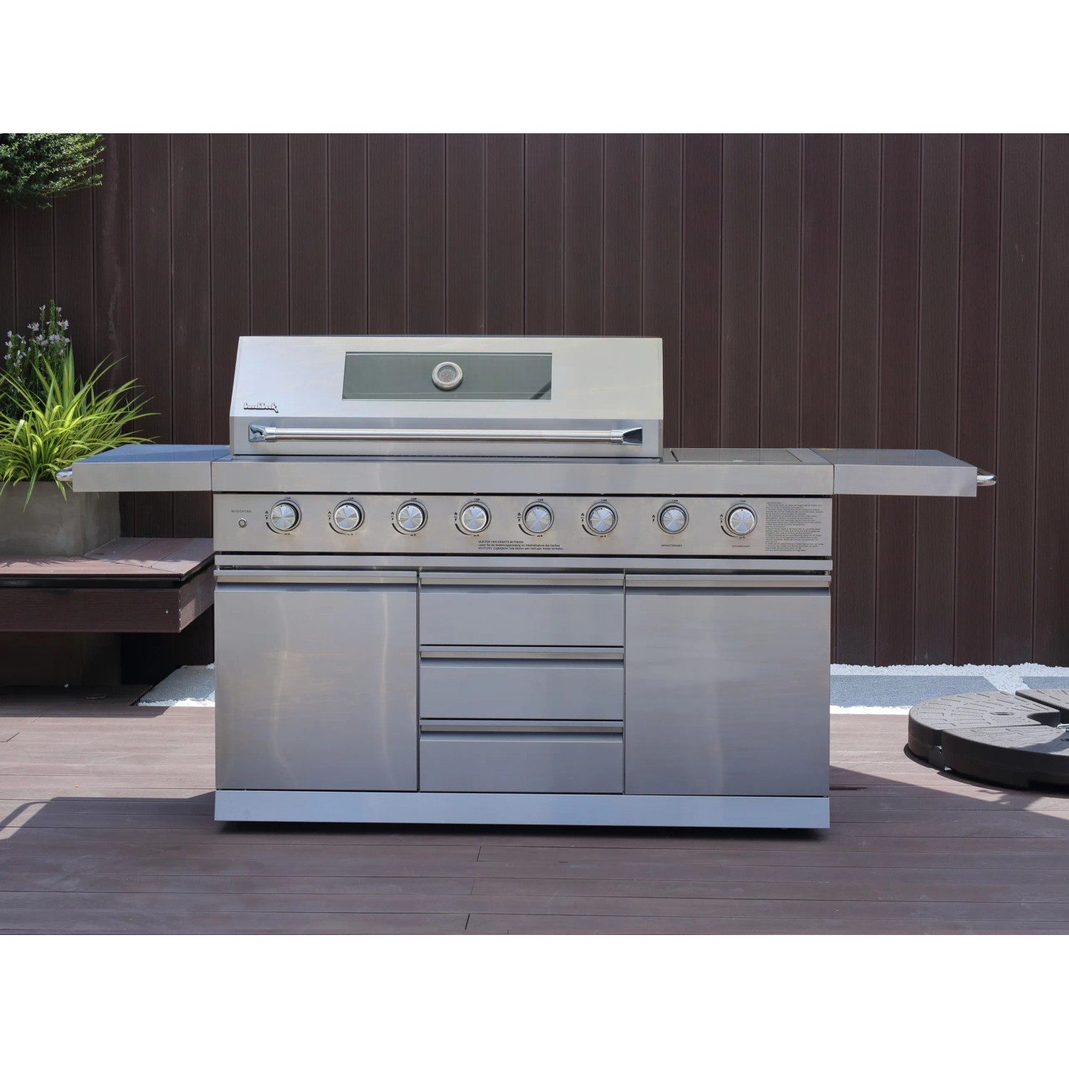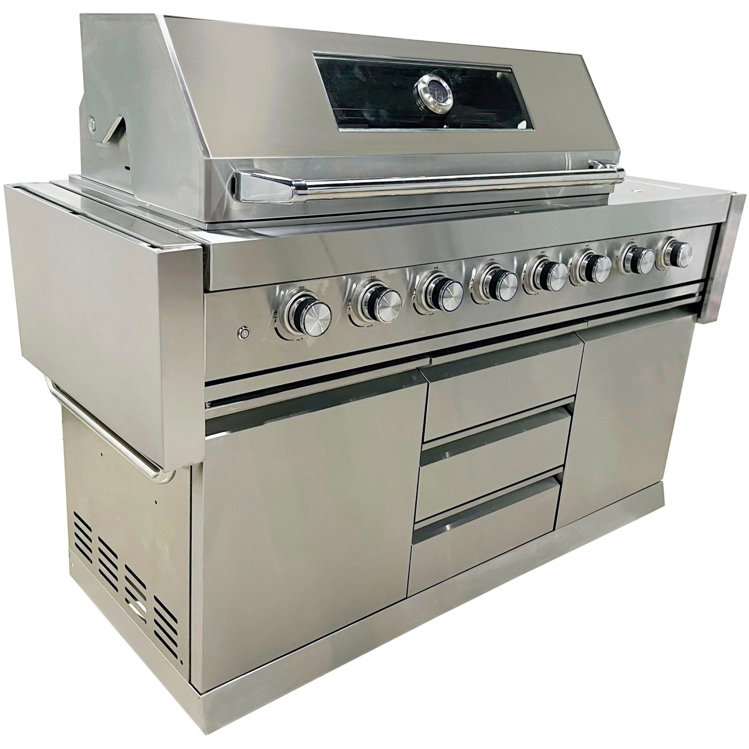 Šesť výkonných nerezových horákov je možné ovládať samostatne a ponúka tak možnosť grilovať priamo alebo nepriamo. Teplomer integrovaný do krytu grilu vám umožní mať nad grilovaným jedlom plnú kontrolu a na praktickom bočnom sporáku je možné pripraviť vhodné prílohy, polievky alebo omáčky. Priestranné pracovné plochy ponúkajú dostatok priestoru na prípravu jedla av prípade potreby ich možno zmenšiť pre úsporu miesta pomocou dvoch výklopných políc na boku. Hrnce, dosky, grilovacie príbory atď. je možné uložiť do dvoch spodných skriniek a troch zásuviek a sú tak vždy rýchlo po ruke. Pripojovacia hadica a regulátor tlaku plynu sú súčasťou dodávky.
