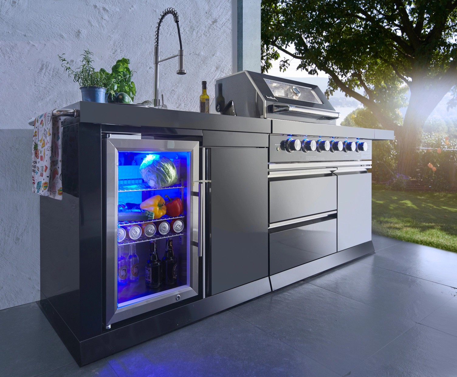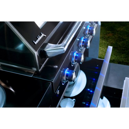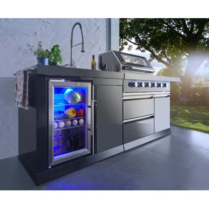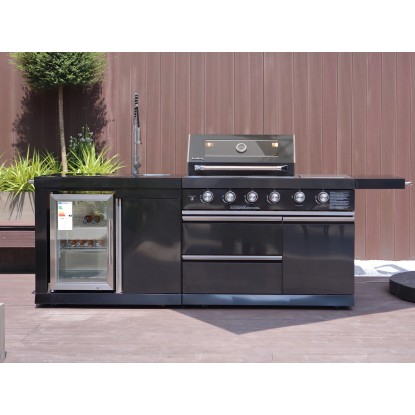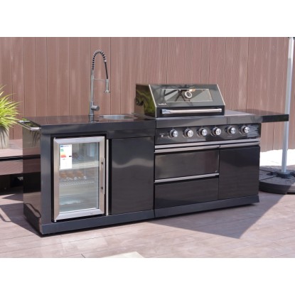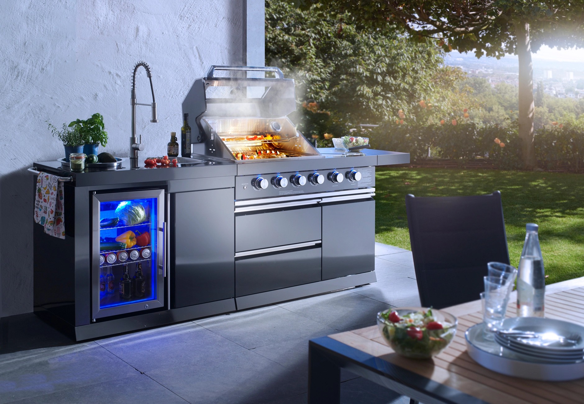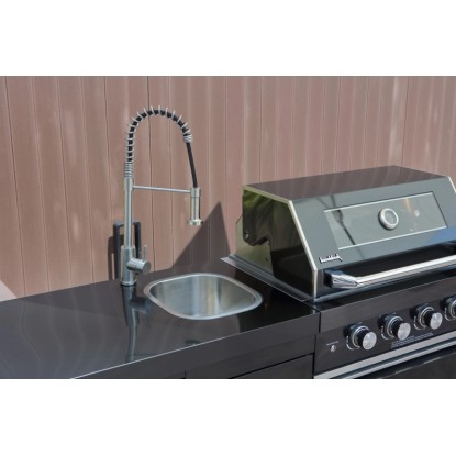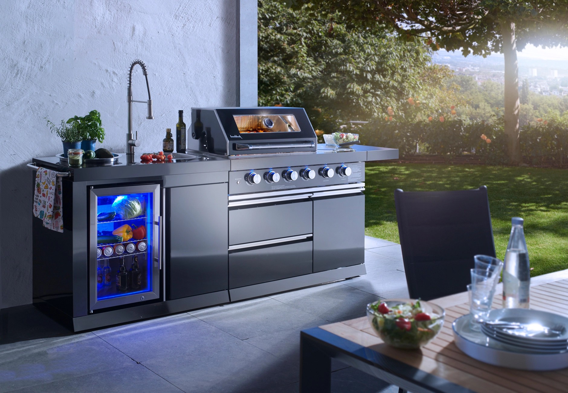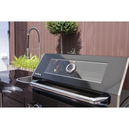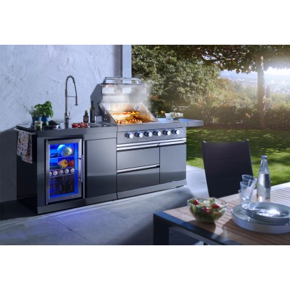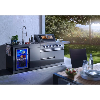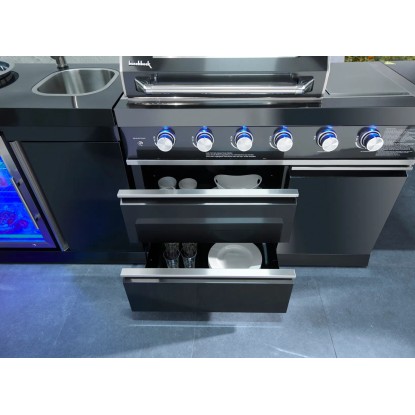 Stredom záujmu je plynový gril s nerezovým krytom, ktorý umožňuje priame alebo nepriame grilovanie. Vstavaný teplomer uľahčuje sledovanie teploty, čo znamená, že lahodné grilované pokrmy je možné uvariť k dokonalosti. Zvlášť praktický je bočný horák, na ktorom je možné pripravovať omáčky alebo prílohy, rovnako ako bočná výklopná polica pre väčší pracovný priestor. Vstavaná chladnička na nápoje a drez vrátane armatúr skvele dopĺňajú vonkajšiu kuchyňu. Za dvoma dvierkami skrine av dvoch zásuvkách je dostatok úložného priestoru pre grilovacie príslušenstvo alebo iné náčinie.