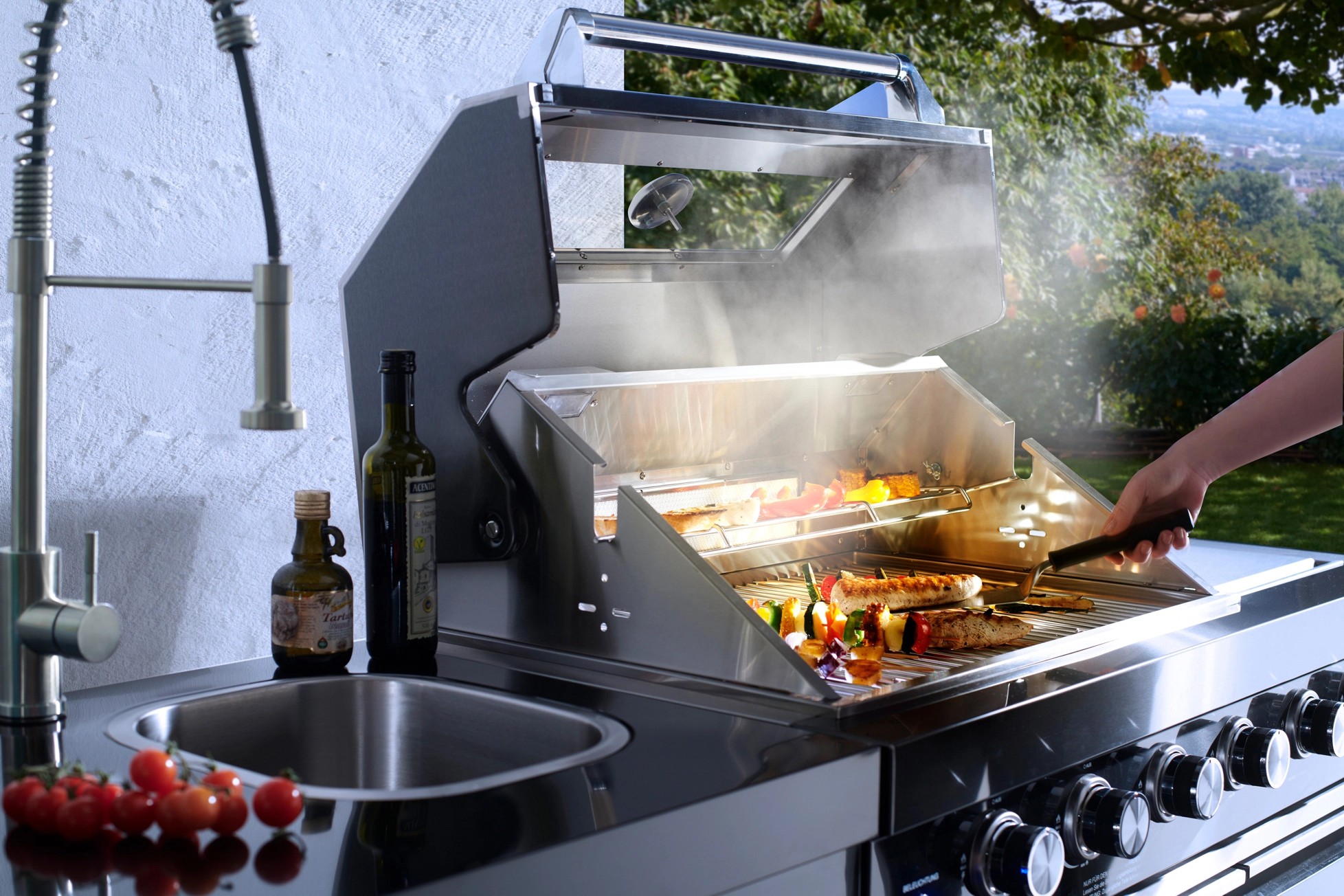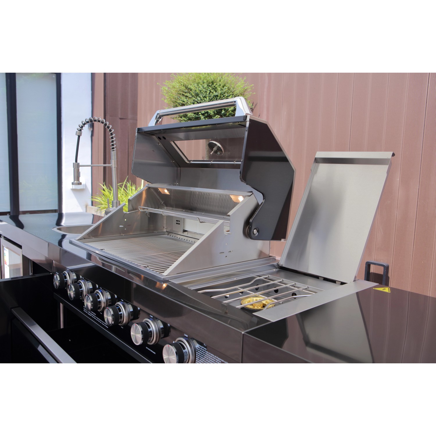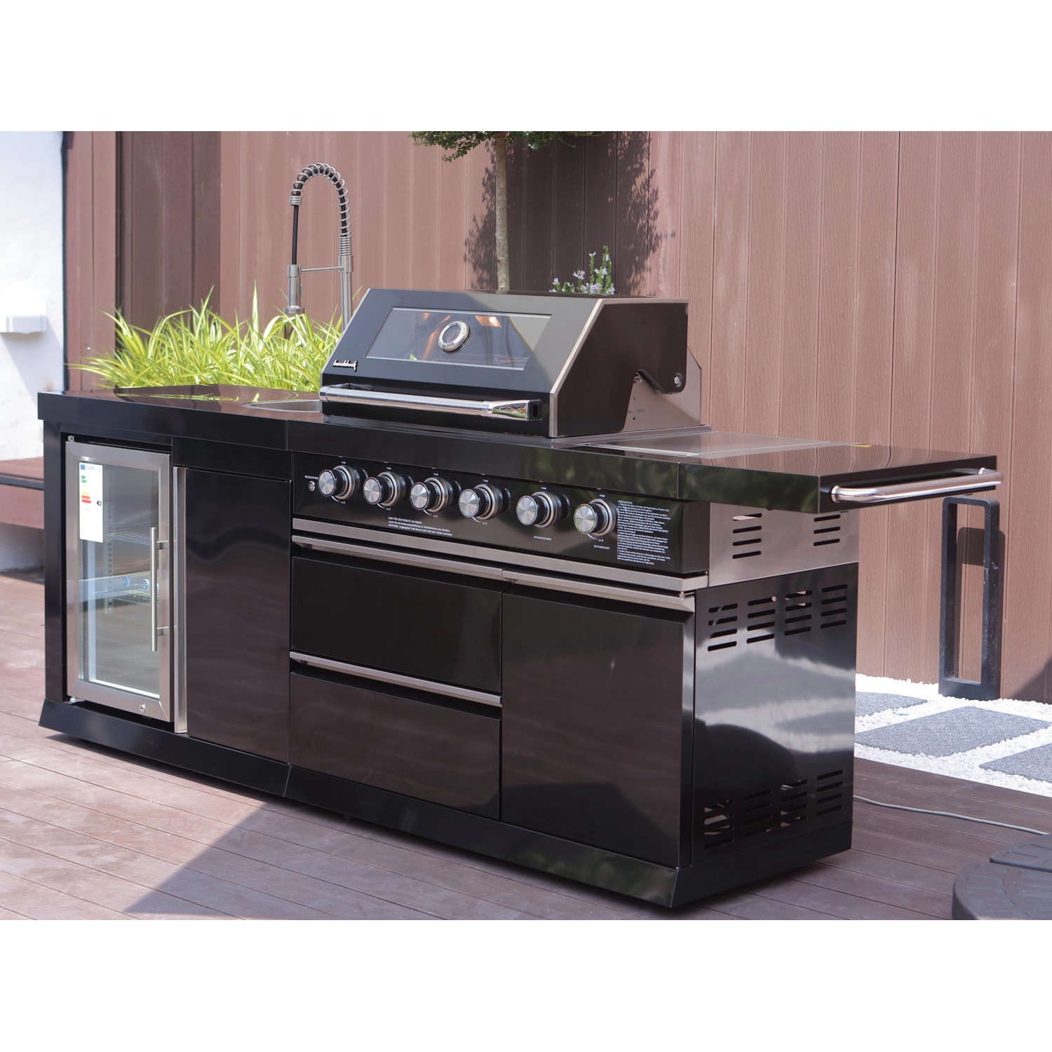 Stredom záujmu je plynový gril s nerezovým krytom, ktorý umožňuje priame alebo nepriame grilovanie. Vstavaný teplomer uľahčuje sledovanie teploty, čo znamená, že lahodné grilované pokrmy je možné uvariť k dokonalosti. Zvlášť praktický je bočný horák, na ktorom je možné pripravovať omáčky alebo prílohy, rovnako ako bočná výklopná polica pre väčší pracovný priestor. Vstavaná chladnička na nápoje a drez vrátane armatúr skvele dopĺňajú vonkajšiu kuchyňu. Za dvoma dvierkami skrine av dvoch zásuvkách je dostatok úložného priestoru pre grilovacie príslušenstvo alebo iné náčinie.
